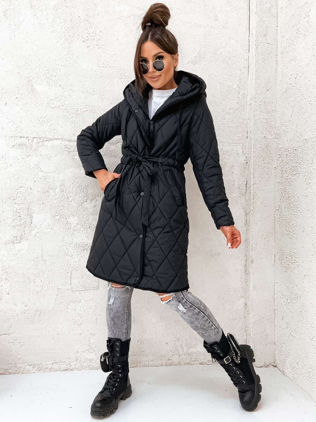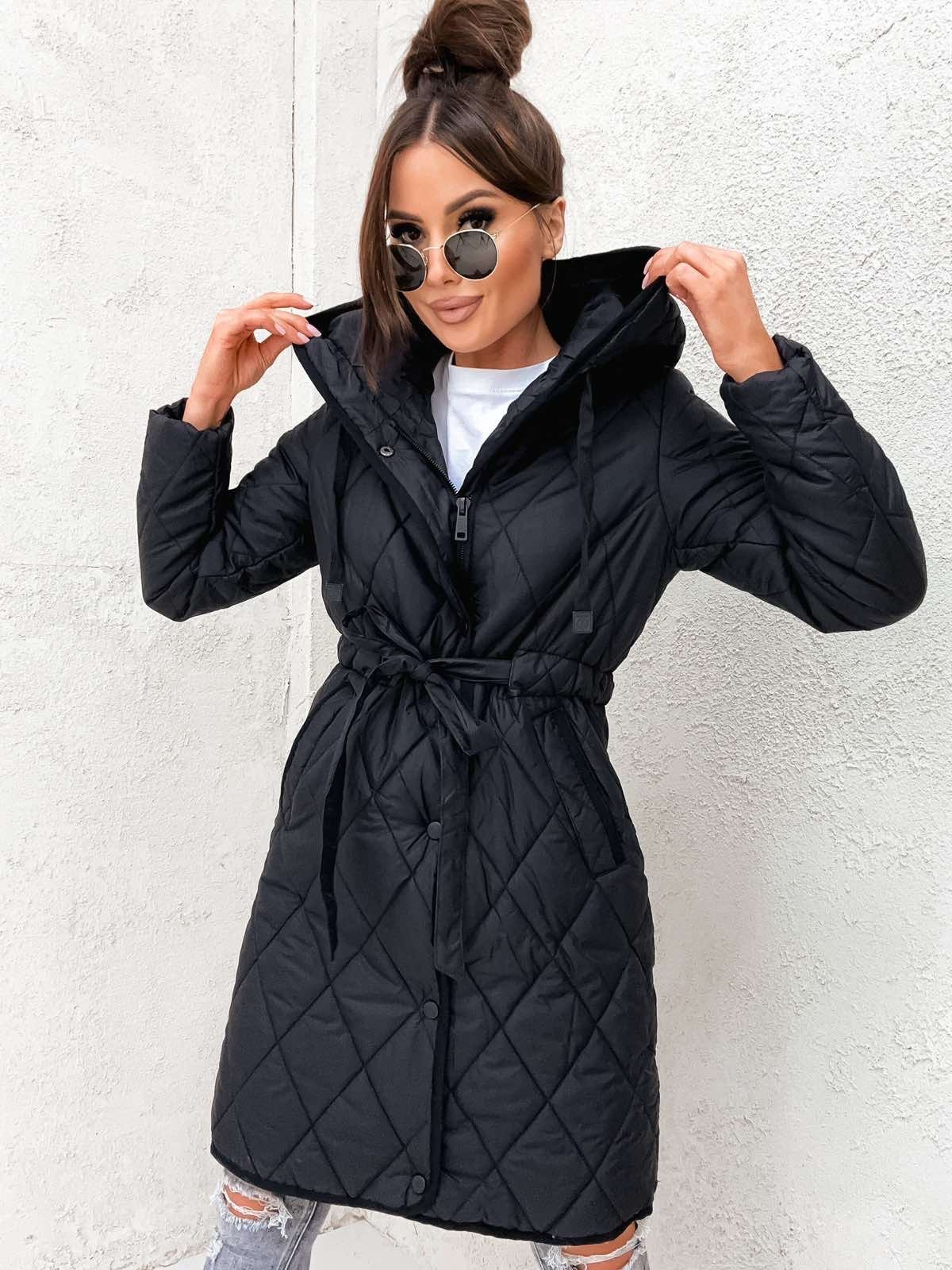 PIKOWANA KURTKA PŁASZCZ WIĄZANY W PASIE- CZARNY