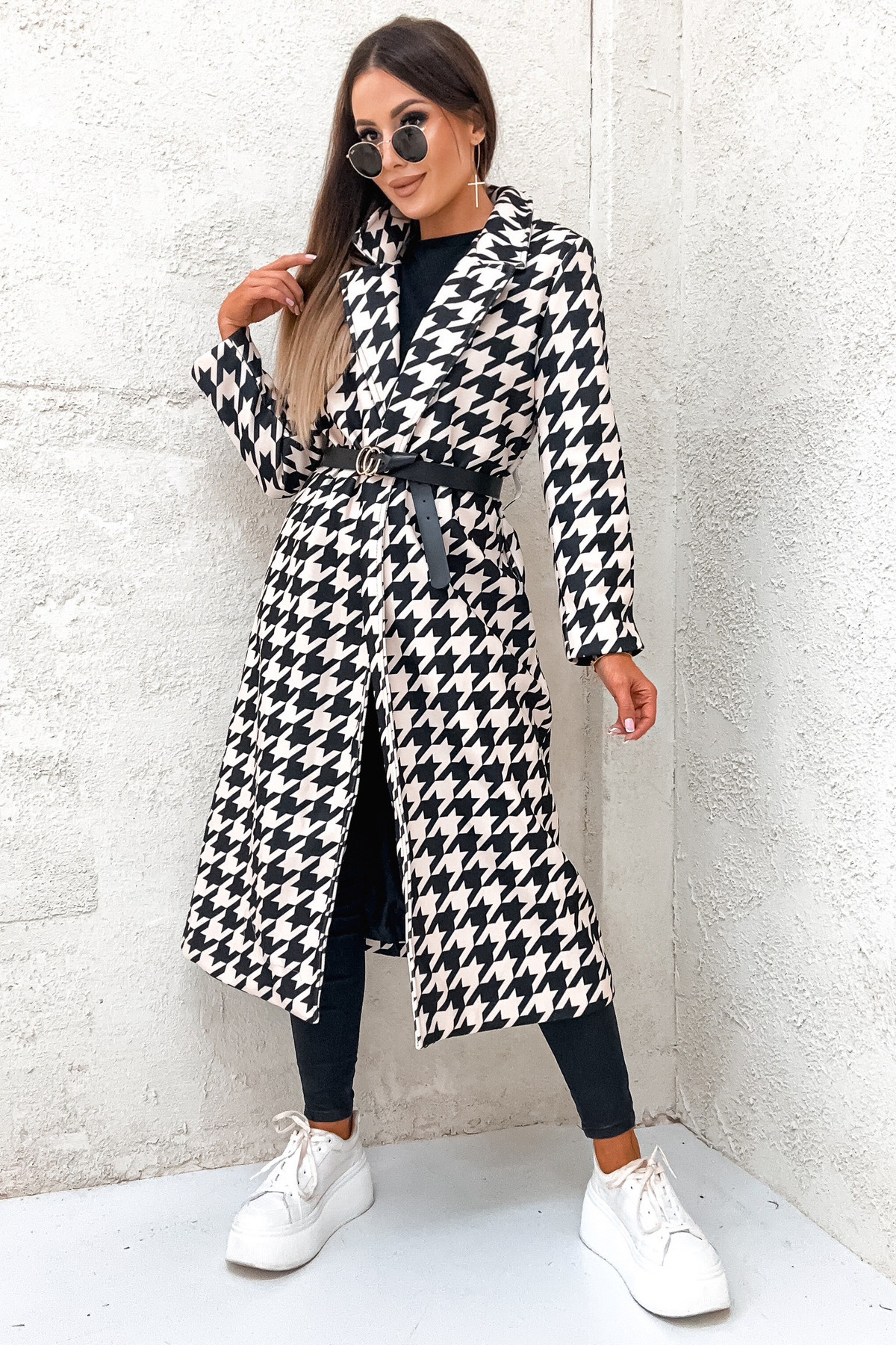 DŁUGI PŁASZCZ W PEPITKĘ WIĄZANY W PASIE