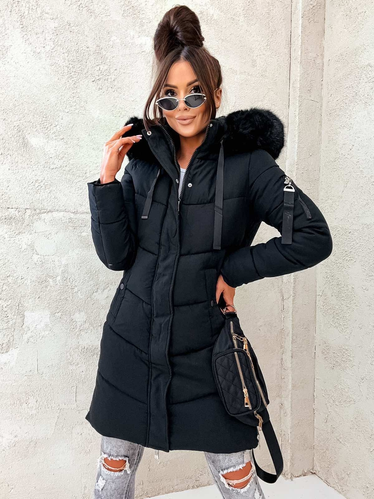 DŁUGA KURTKA Z ZAMKAMI PO BOKACH I FUTRZANYM KAPTUREM- CZARNA