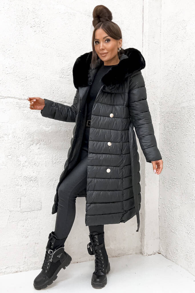 PIKOWANY PŁASZCZ ZE ZŁOTYMI GUZIKAMI I PASKIEM- CZARNY