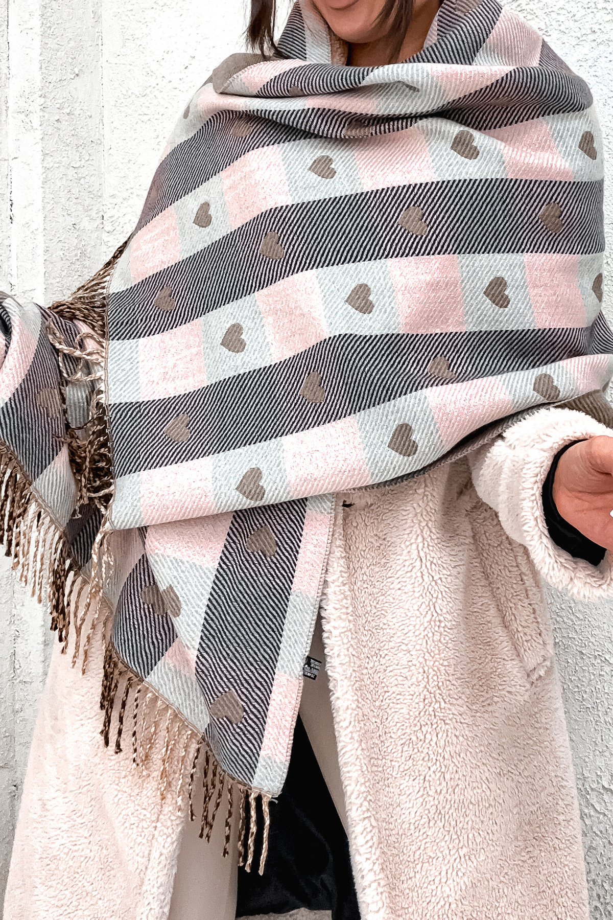 SZAL W DROBNĄ KRATE Z SERCAMI- JASNY RÓŻ