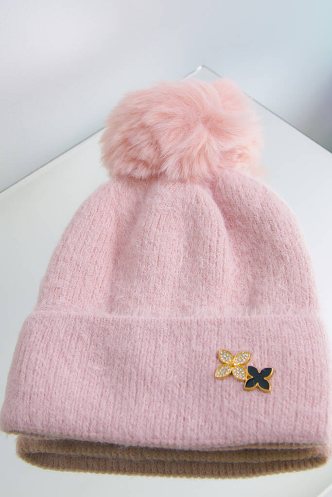 ZIMOWA CZAPKA Z POMPONEM I OZDONYM KWIATKIEM- JASNO RÓŻOWA