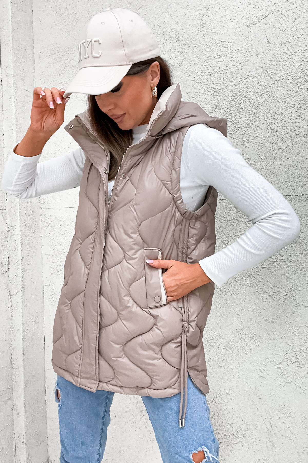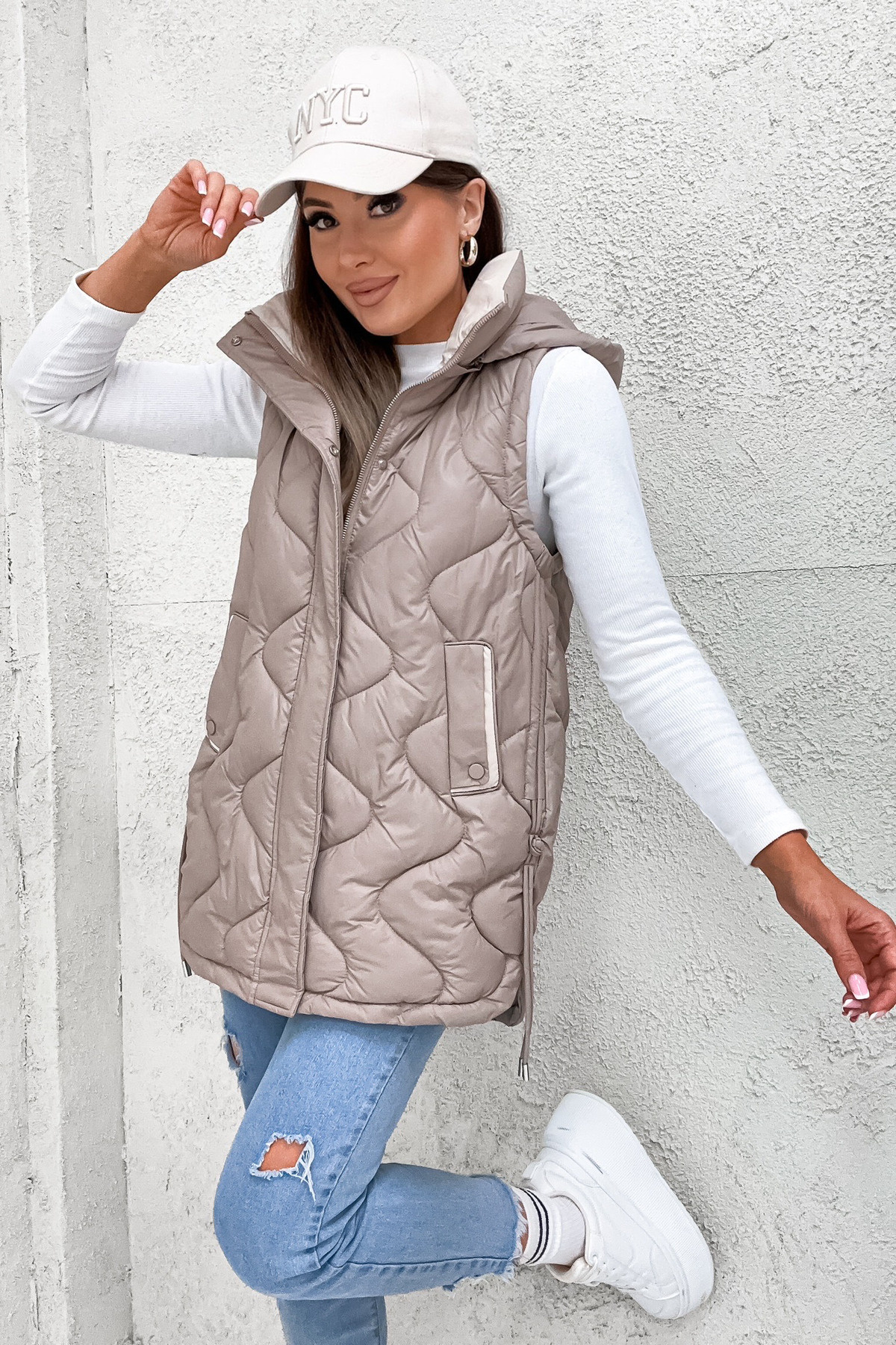 KAMIZELKA PIKOWANA Z KAPTUREM I ŚCIĄGACZAMI PO BOKACH- BRĄZOWA