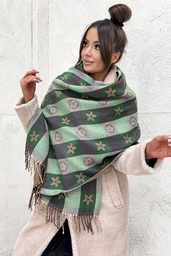 SZAL W KRATE Z MOTYWEM KWIATA Z FRĘDZLAMI- ZIELONY