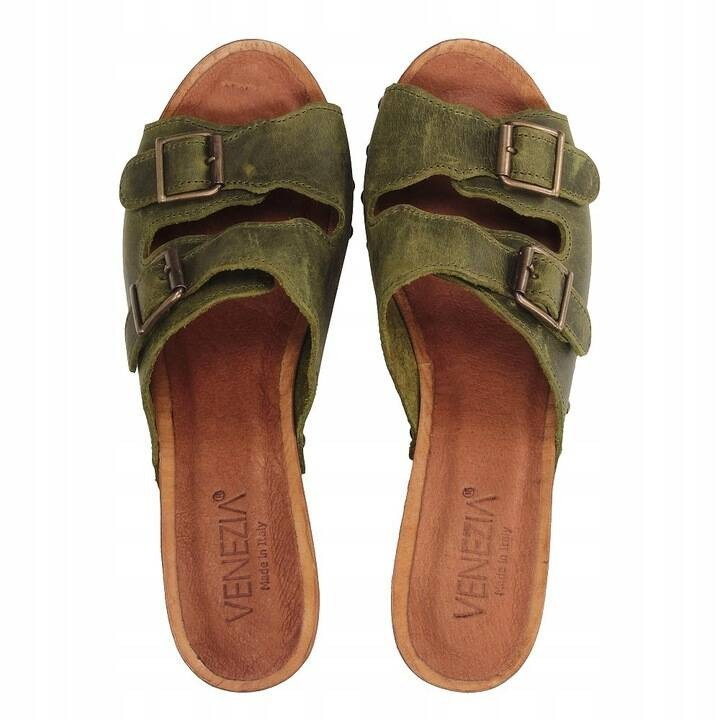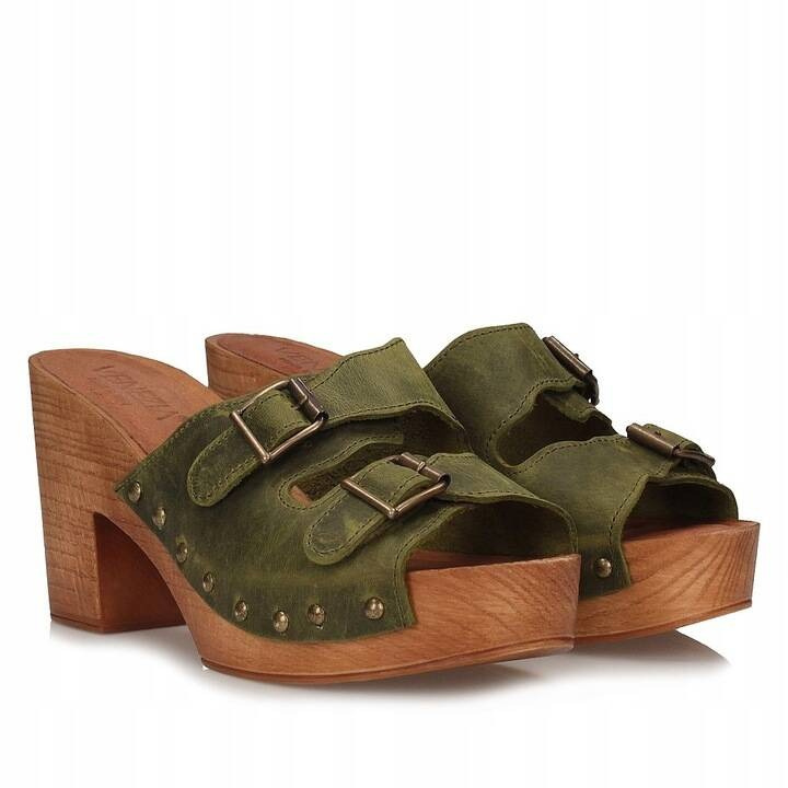 Propozycja obuwia marki Venezia, niebanalne i ponadczasowe chodaki na szerokim obcasie w odsłonie zieleni. Cholewka wykonana z naturalnej skóry licowej vintage. Komfortowa , skórzana wkładka z logo marki.