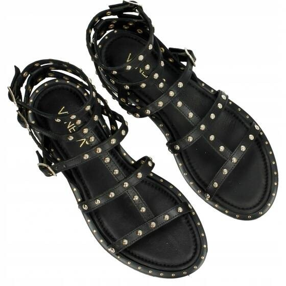 Sandały wykonane ze skóry naturalnej w kolorze czarnym. Wygodna, płaska podeszwa, Ozdobione kompozycją ze złotych nitów. Regulowane paski umieszczone na linii kostki. Skórzana wyściółka zapewni komfort podczas użytkowania.