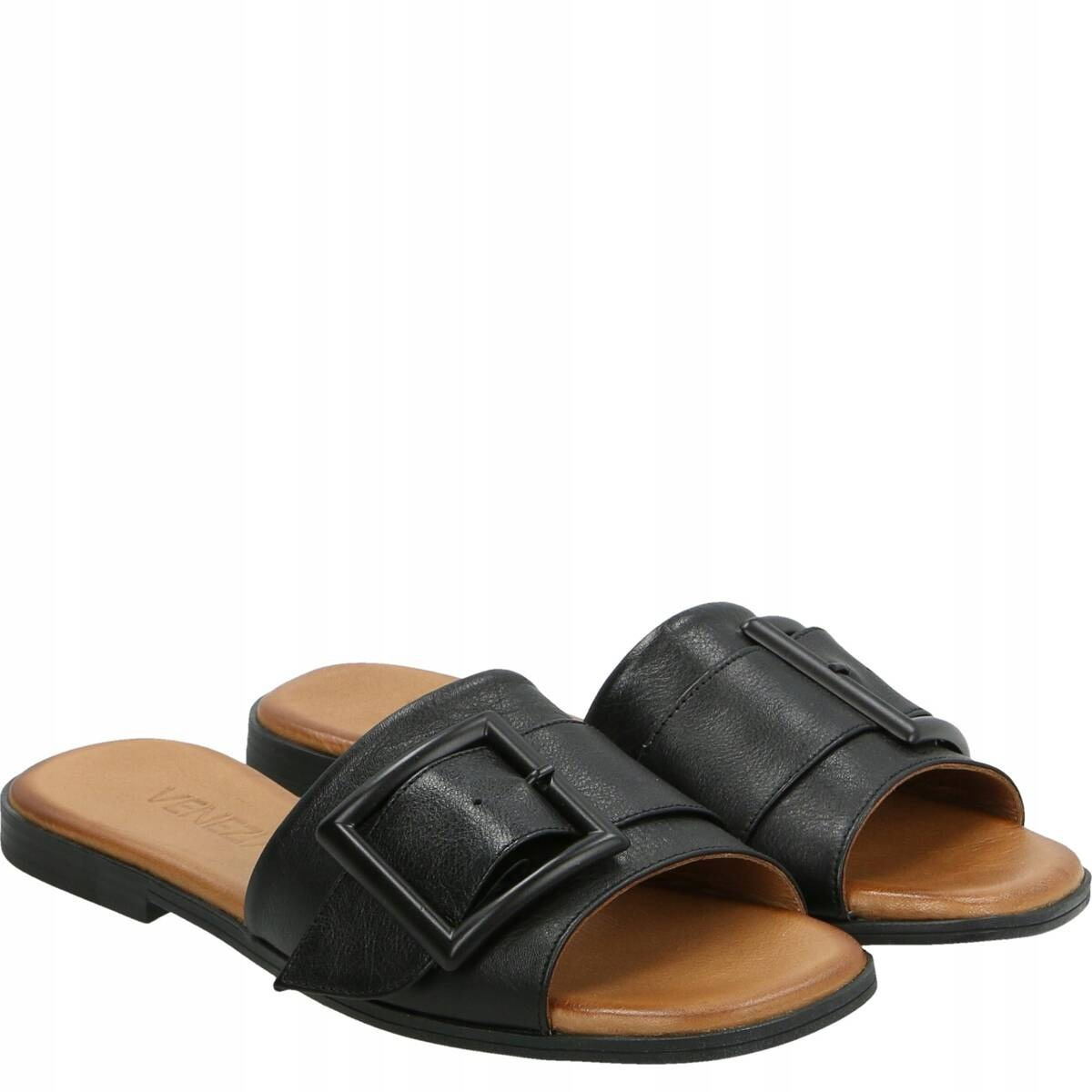 Klapki wykonane z wysokiej jakości skóry cielęcej. Cholewka ozdobiona dużą klamrą oraz oryginalny kwadratowy nosek. Skórzana wkładka podbita miękką gąbką oraz elastyczna podeszwa zapewnią komfort w trakcie użytkowania.