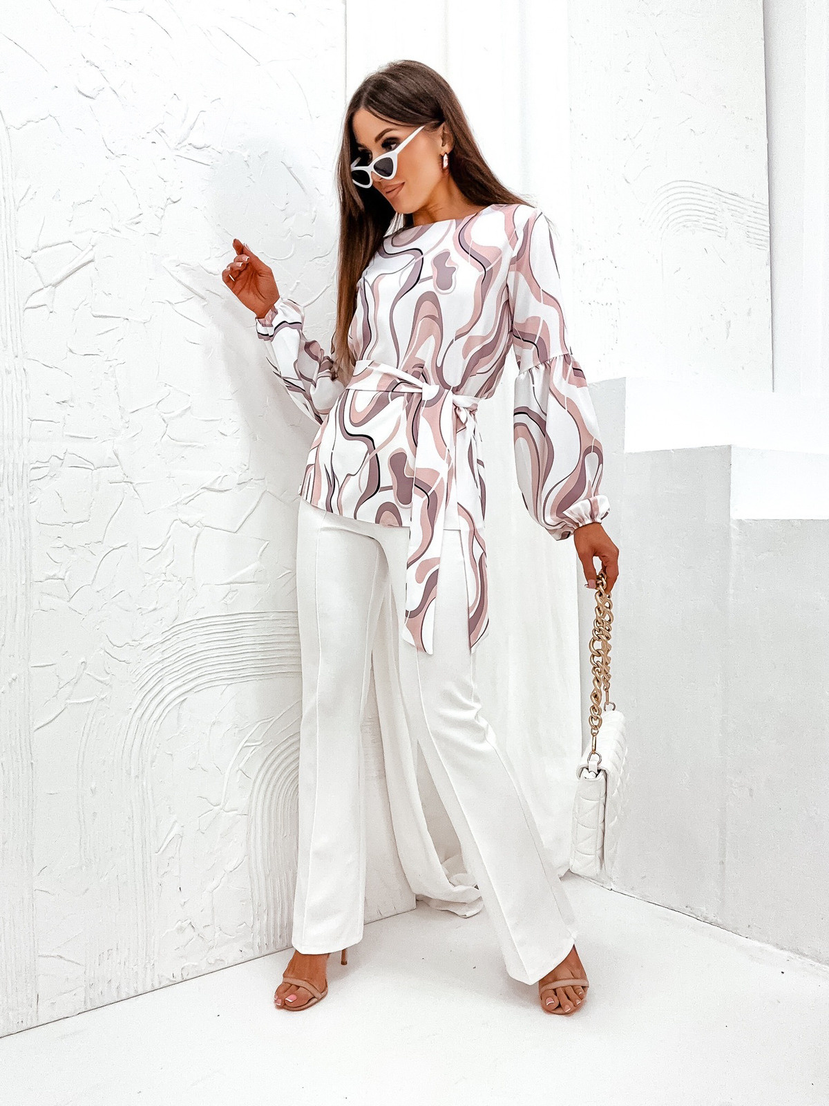BLUZKA Z WIĄZANIEM W PASIE I BUFISATYM RĘKAWEM- BEŻOWA