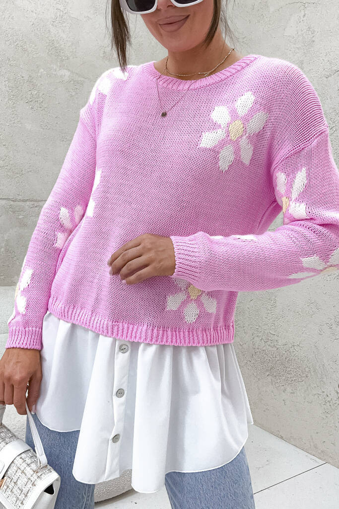 SWETER W KWIATY Z KOSZULOWYM WYKOŃCZENIEM- RÓŻOWY