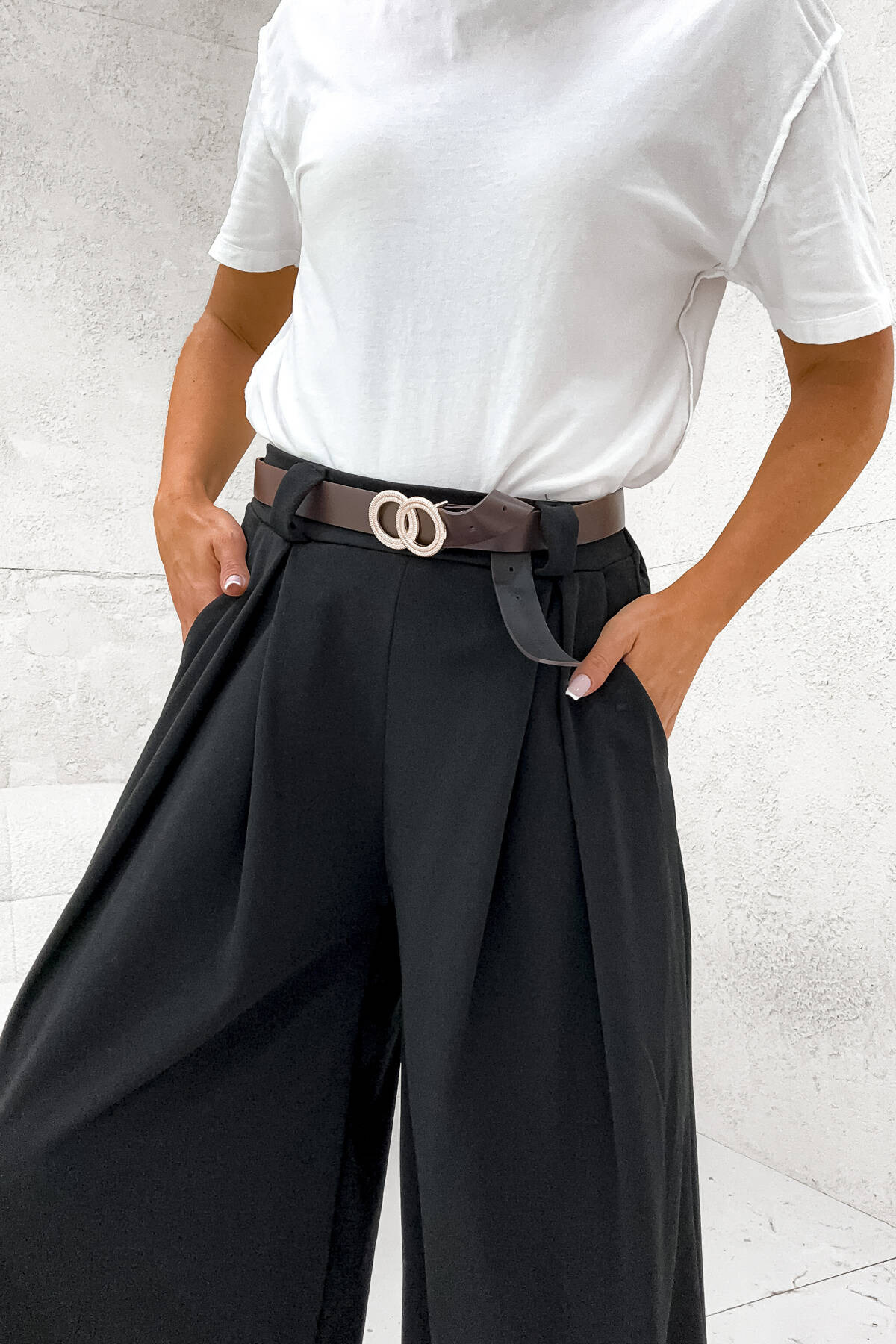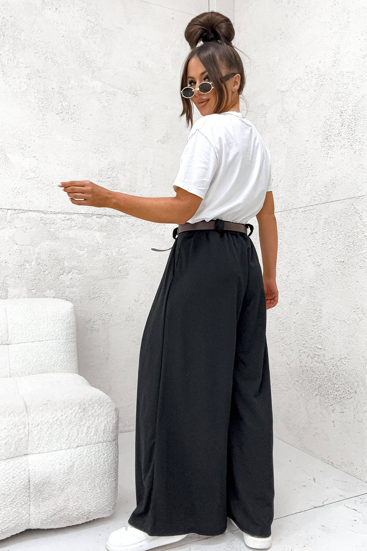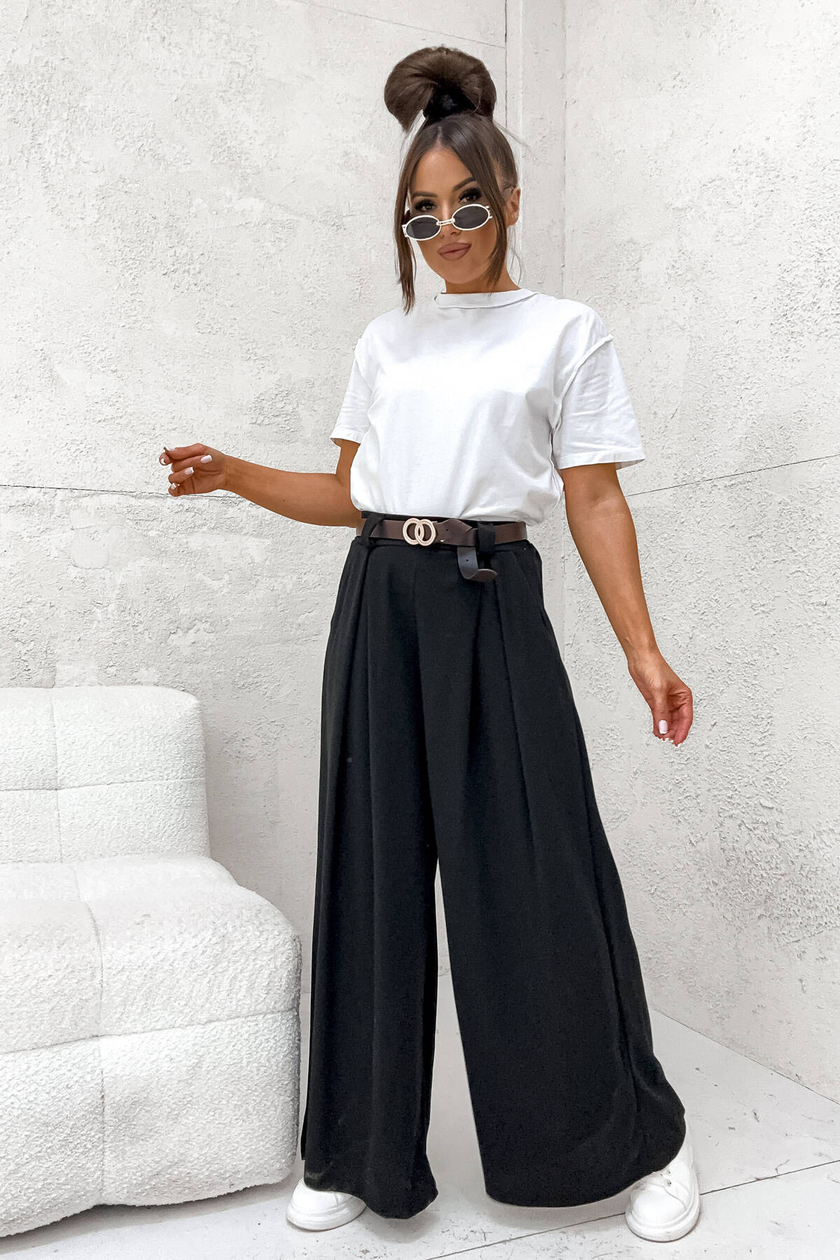 SZEROKIE SPODNIE ONESIZE Z WYSOKIM STANEM I PASKIEM- CZARNE