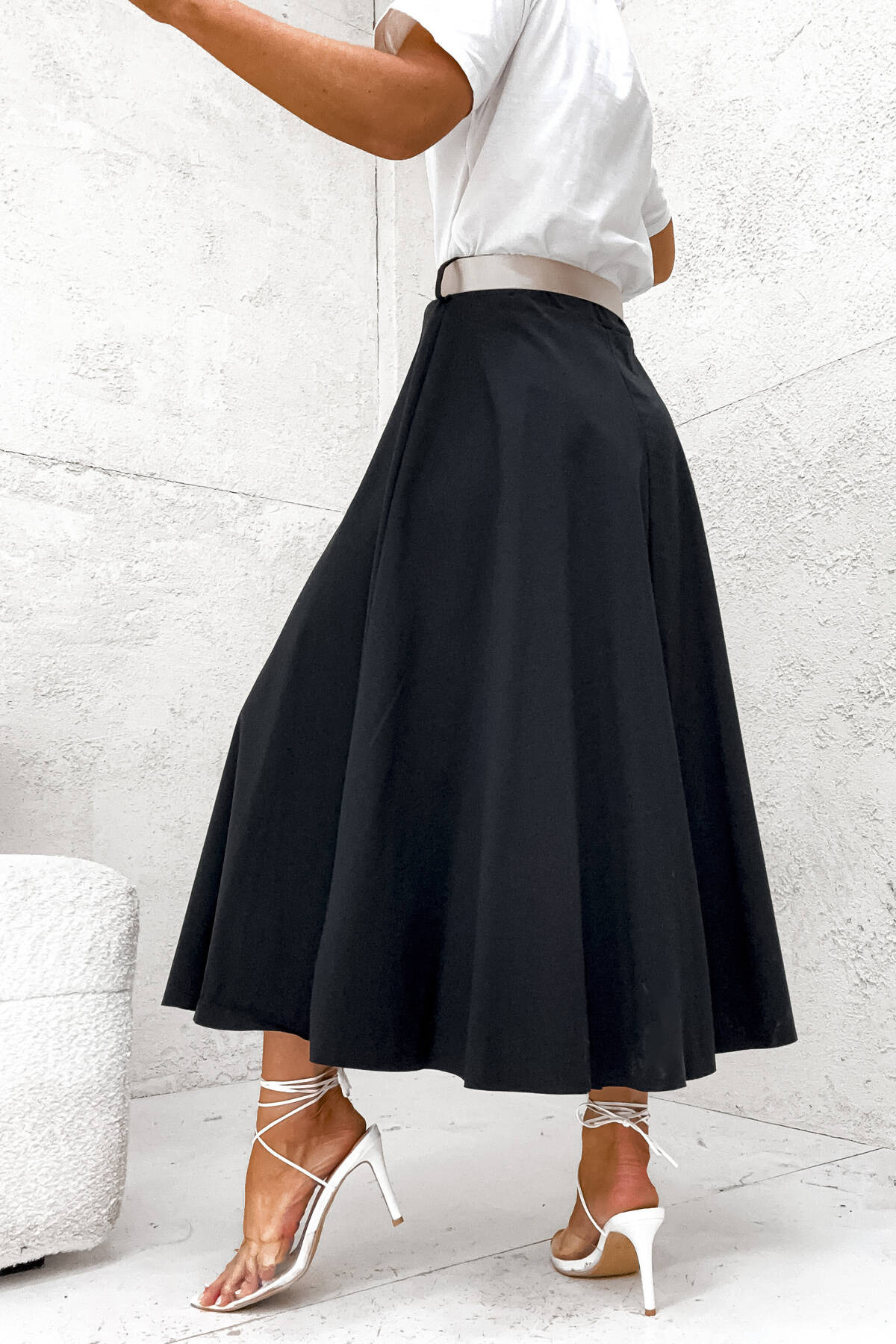 ROZKLOSZOWANA BAWEŁNIANA SPÓDNICA Z PASKIEM- CZARNA