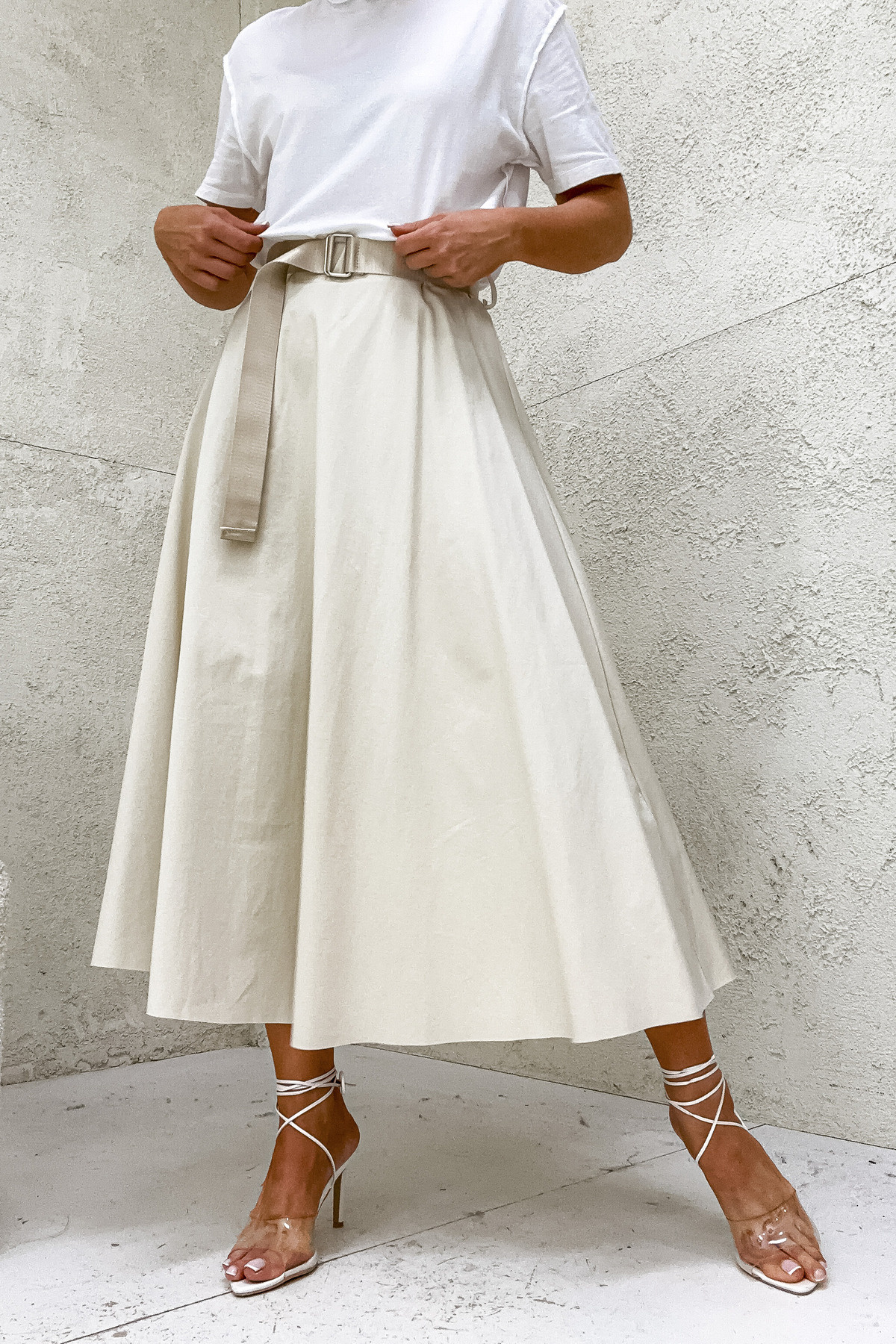 ROZKLOSZOWANA BAWEŁNIANA SPÓDNICA Z PASKIEM- BEŻOWA