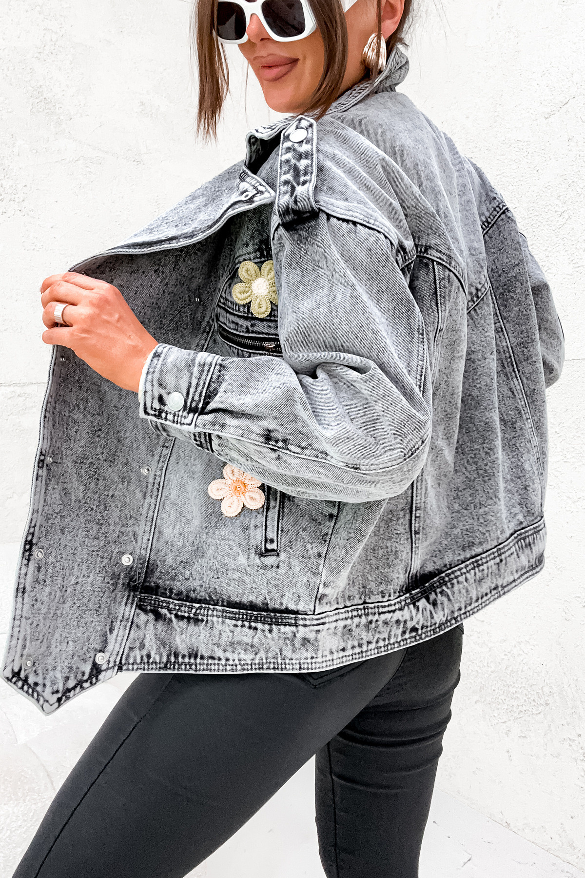 KURTKA JEANSOWA RAMONESKA Z NASZYWKĄ W KWIATY- SZARA