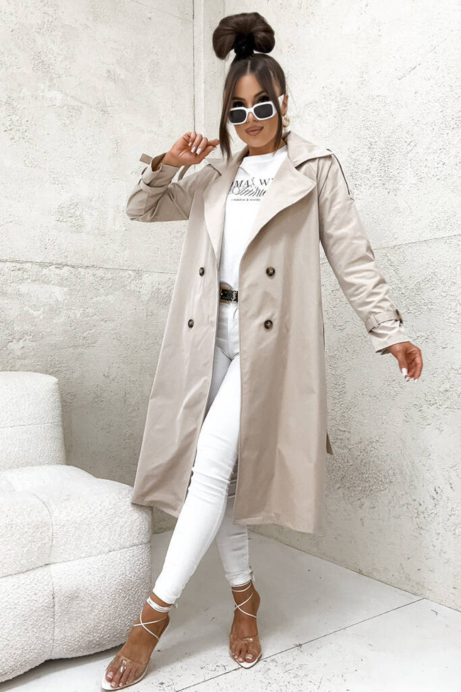 DŁUGI PŁASZCZ TRENCZ WIĄZANY W PASIE- BEŻOWY