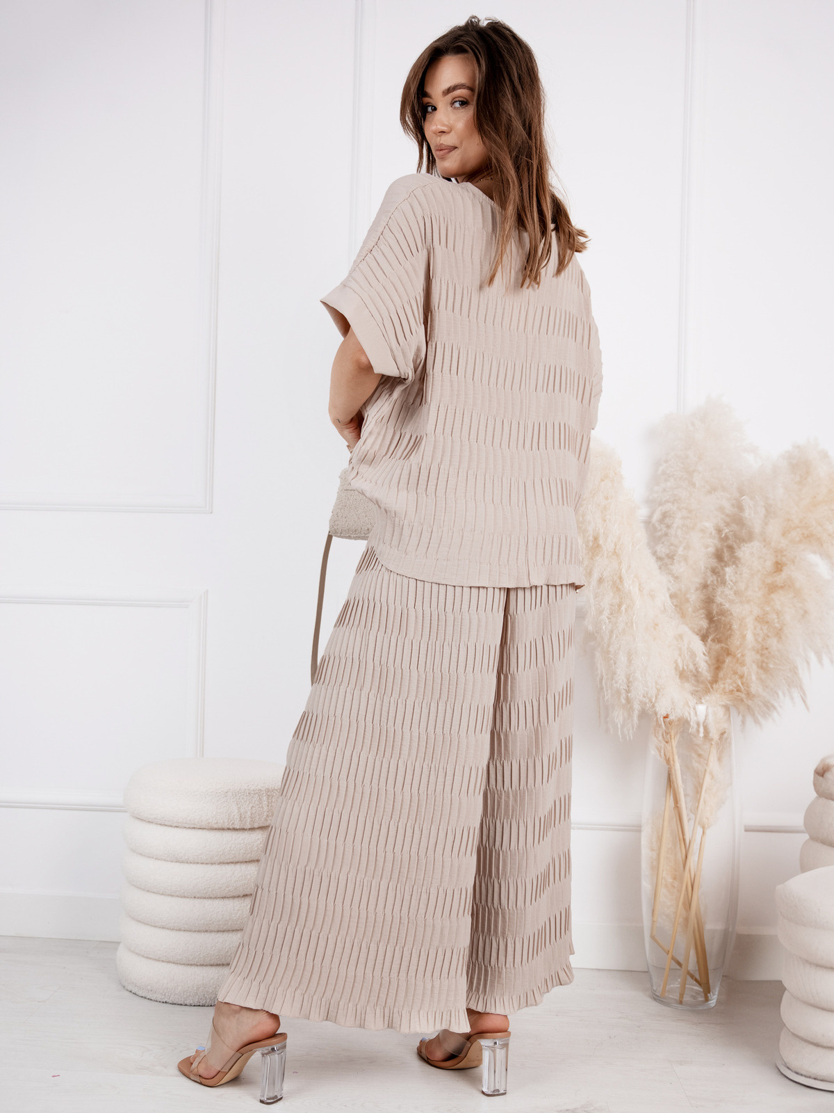 KARBOWANY KOMPLET SZEROKIE SPODNIE Z PASKIEM+ BLUZKA- BEŻOWY