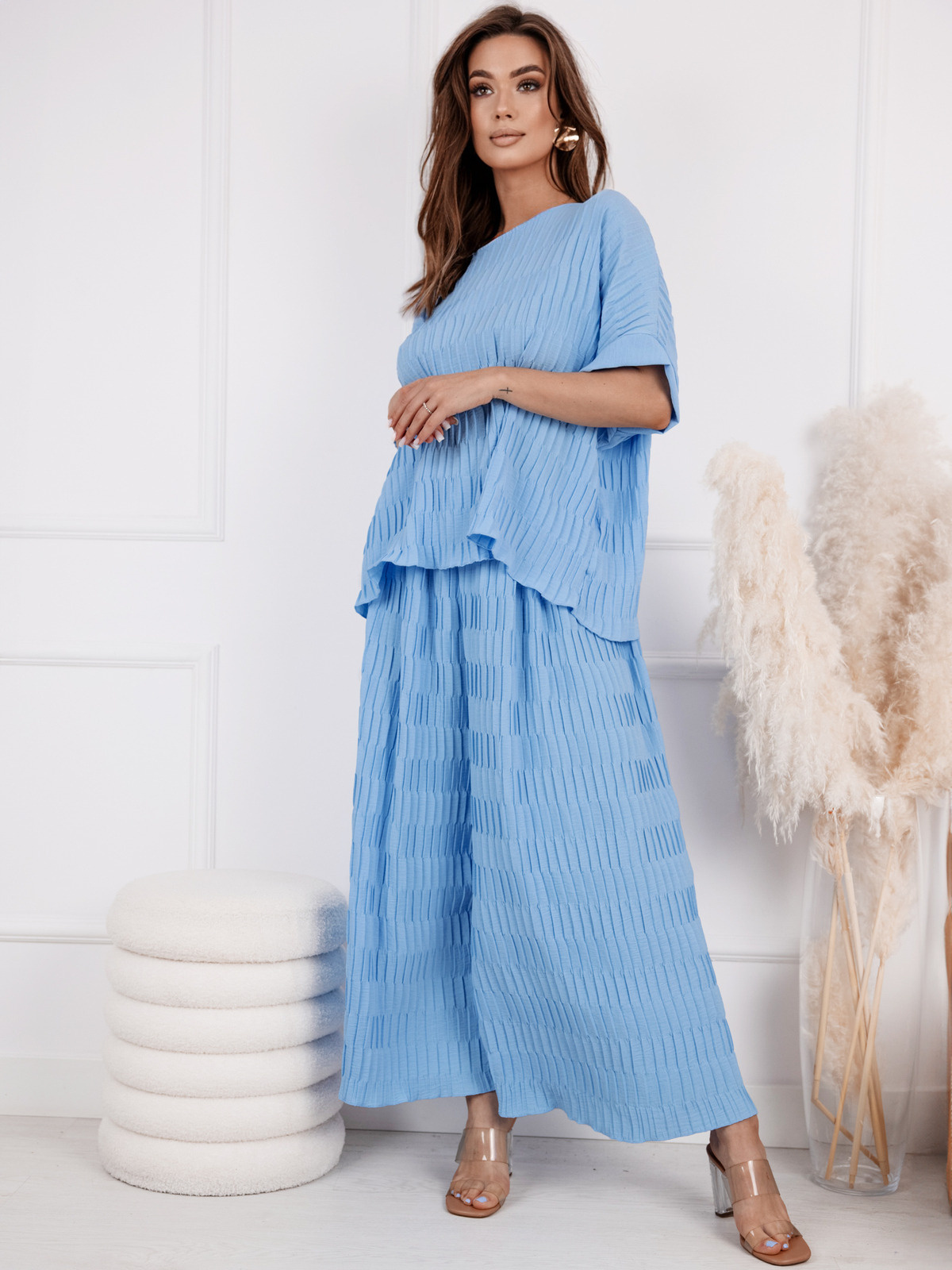 KARBOWANY KOMPLET SZEROKIE SPODNIE Z PASKIEM+ BLUZKA- NIEBIESKI