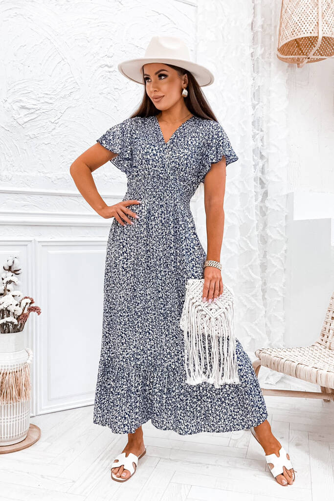 SUKIENKA MAXI W KWIATY I ZŁOTE GWIAZDKI DEKOLT KOPERTOWY-GRANATOWA