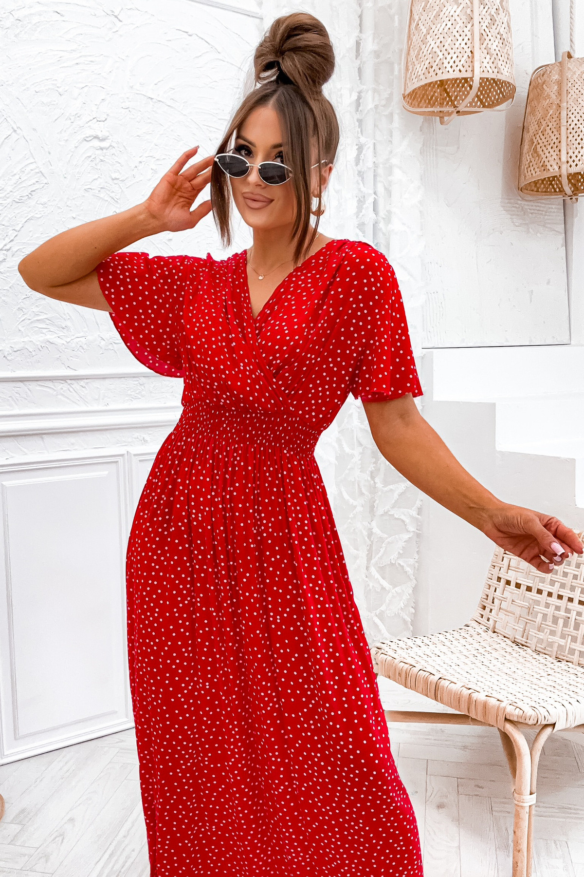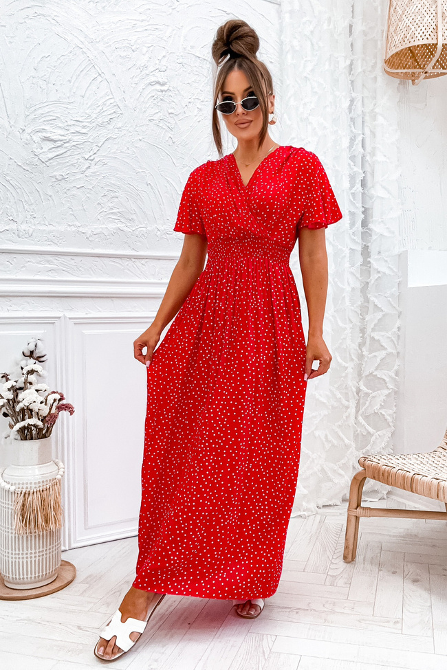 SUKIENKA MAXI W KROPKI Z DEKOLTEM KOPERTOWYM- CZERWONA
