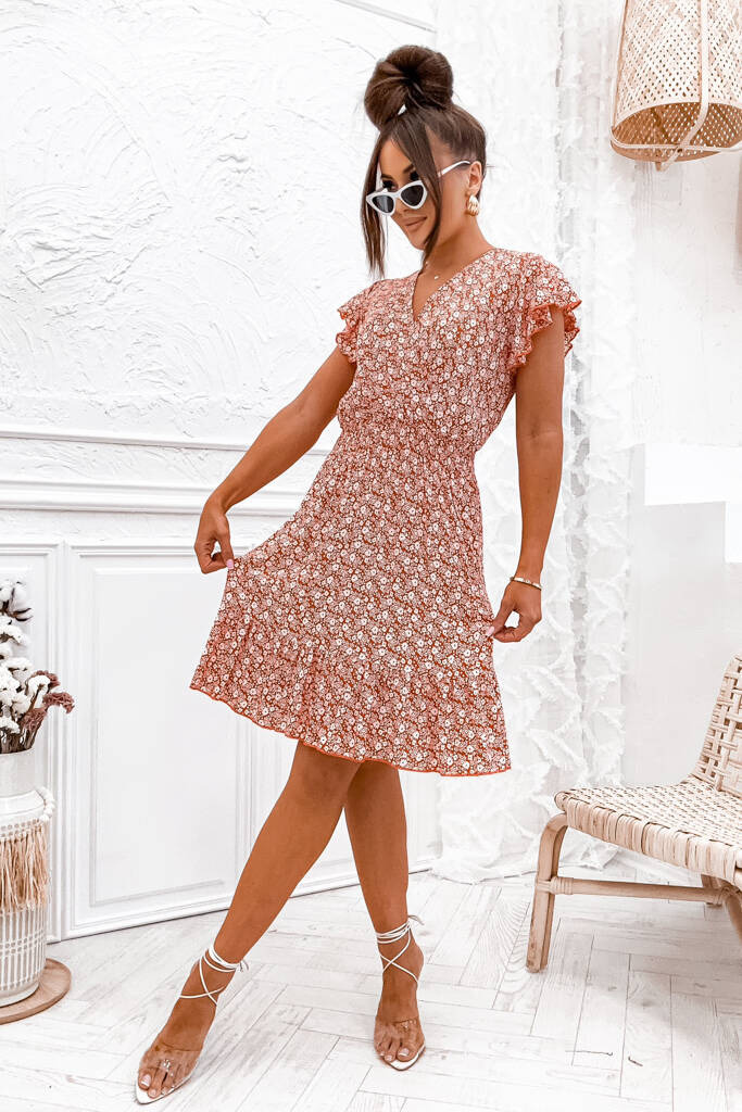 SUKIENKA MIDI W DROBNE KWIATY I GUMKĄ W PASIE- POMARAŃCZOWA