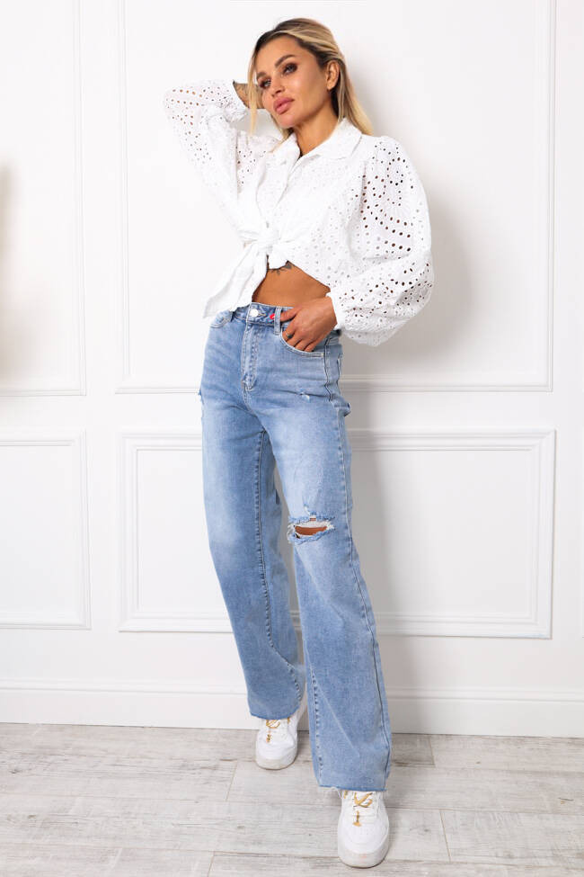 SZEROKIE SPODNIE JENASOWE Z DZIURA I SUROWĄ NOGAWKĄ