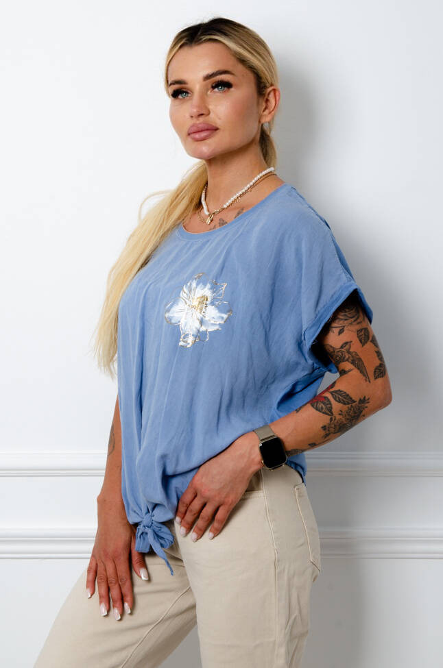 BLUZKA Z KWIATEM I WIĄZANIEM NA DOLE- NIEBIESKA