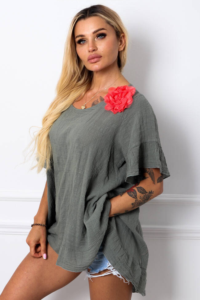 ASYMETRYCZNA BLUZKA Z LNU+ OZDOBNY KWIAT- KHAKI