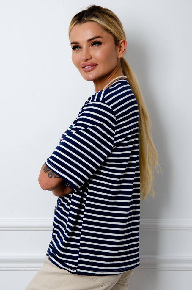 T-SHIRT W PASKI Z OZDOBNĄ APLIKACJĄ- GRANATOWY
