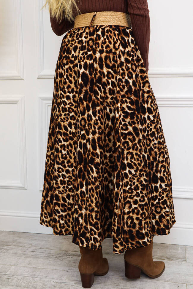 Spódnica midi z guziczkami, wzór panterki. W zestawie modny pasek który podkreśli Twoją talię.