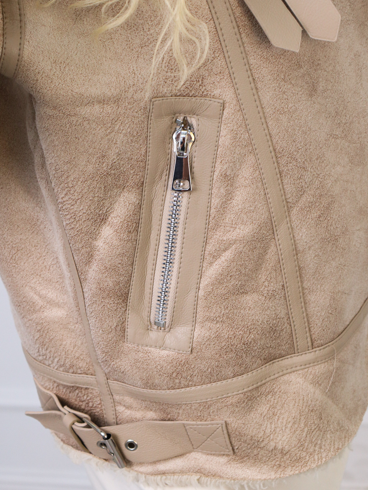 ZAMSZOWA KURTKA Z KOŻUSZKIEM Z OZDOBNYMI PASKAMI- BEŻOWA