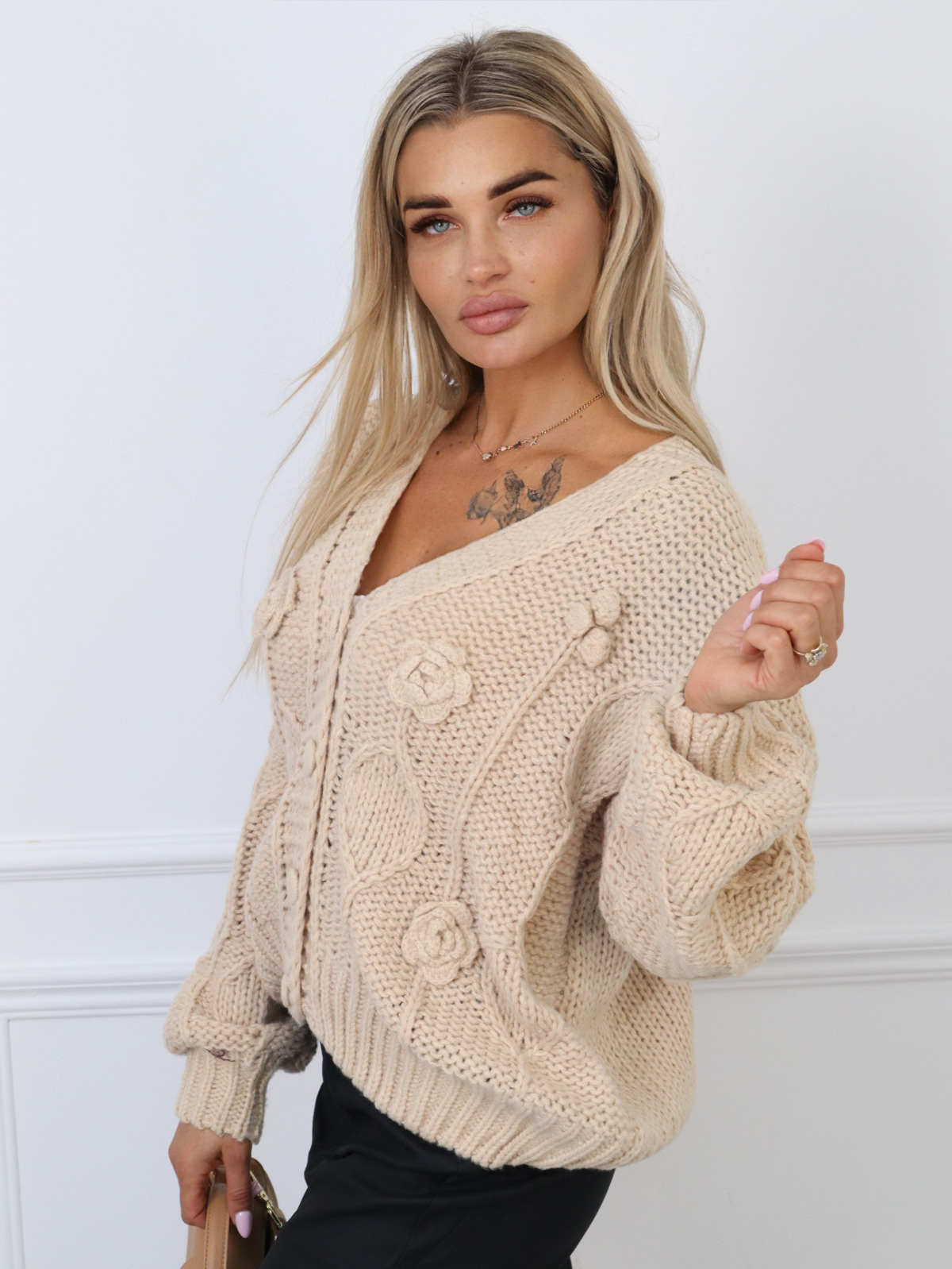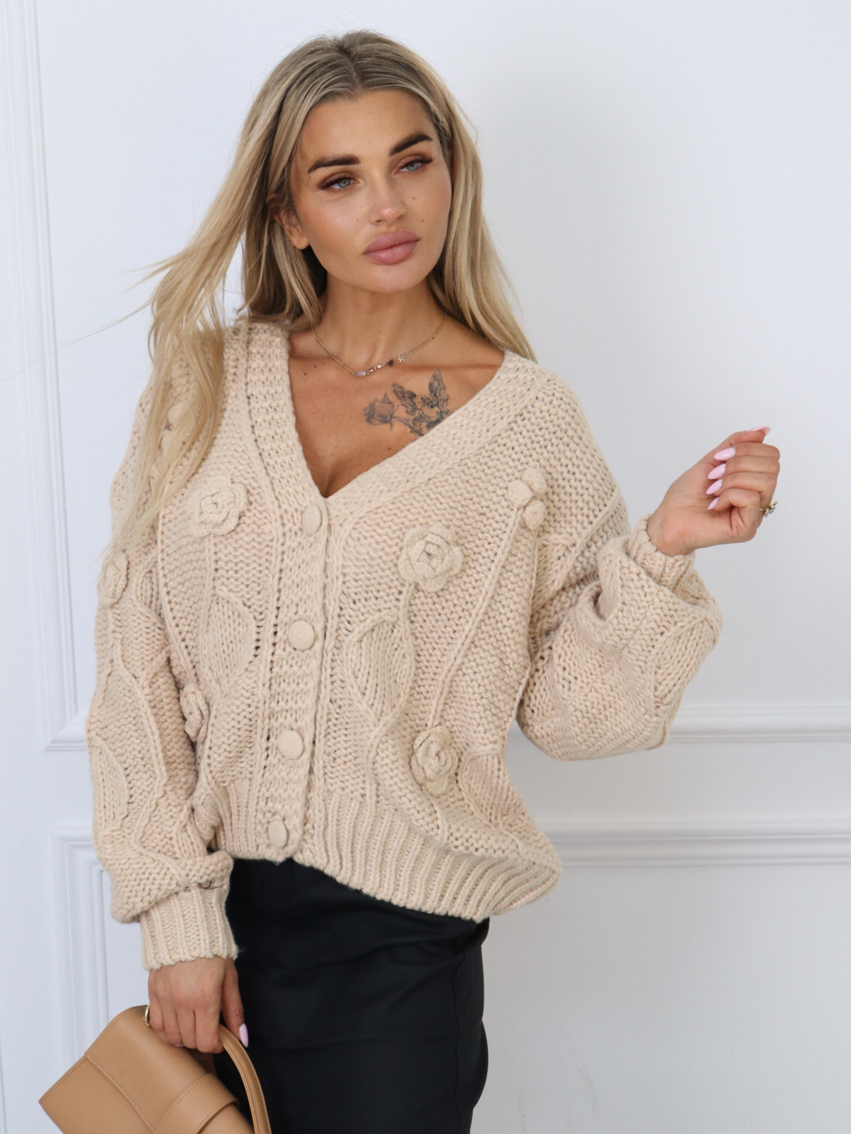 SWETER ROZPINANY Z OZDOBYMI NASZYWANYMI KWIATAMI-BRĄZOWY