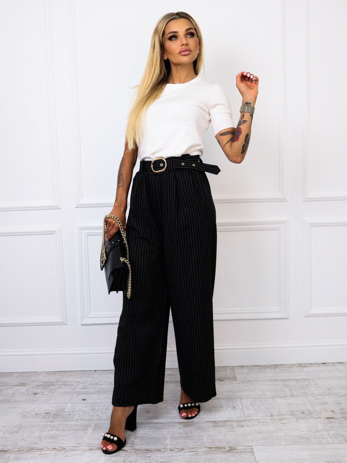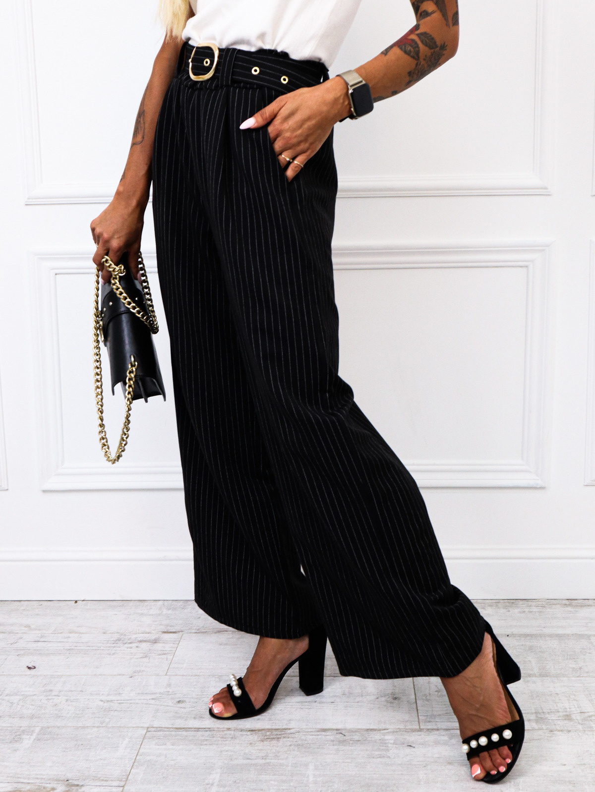 ELEGANCKIE SPODNIE W PASKI Z SZEROKĄ NOGAWKĄ+ PASEK- CZARNE