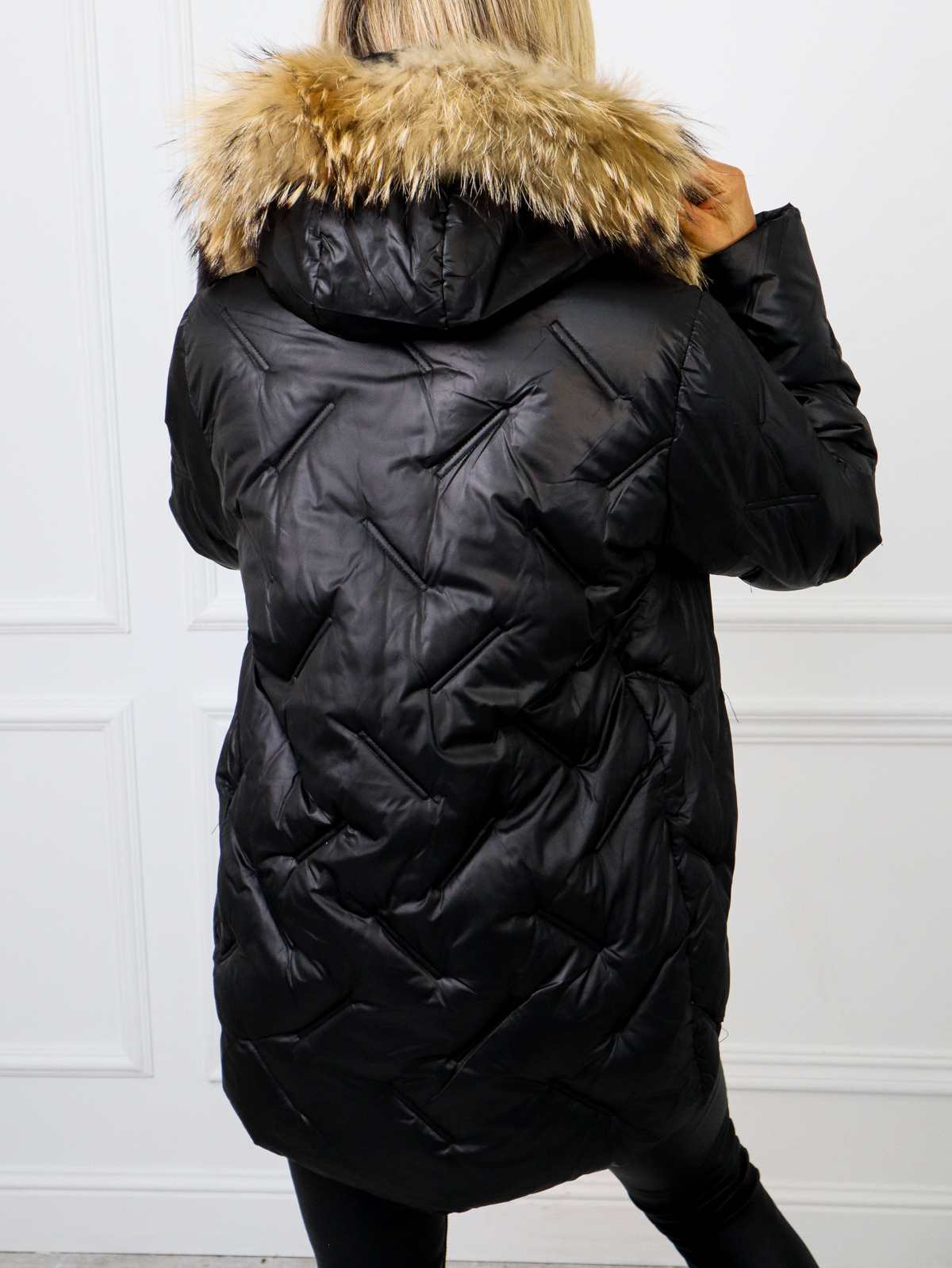 KURTKA PIKOWANA Z FUTERKIEM I OZDOBNYM BRELOKIEM-CZARNA