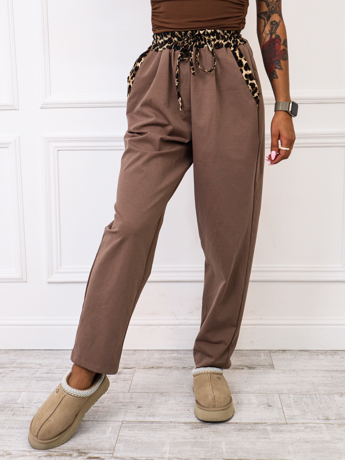 MATERIAŁOWE SPODNIE Z OZDOBNYMI PANTERKOWYMI WSTAWKAMI- BEŻOWE