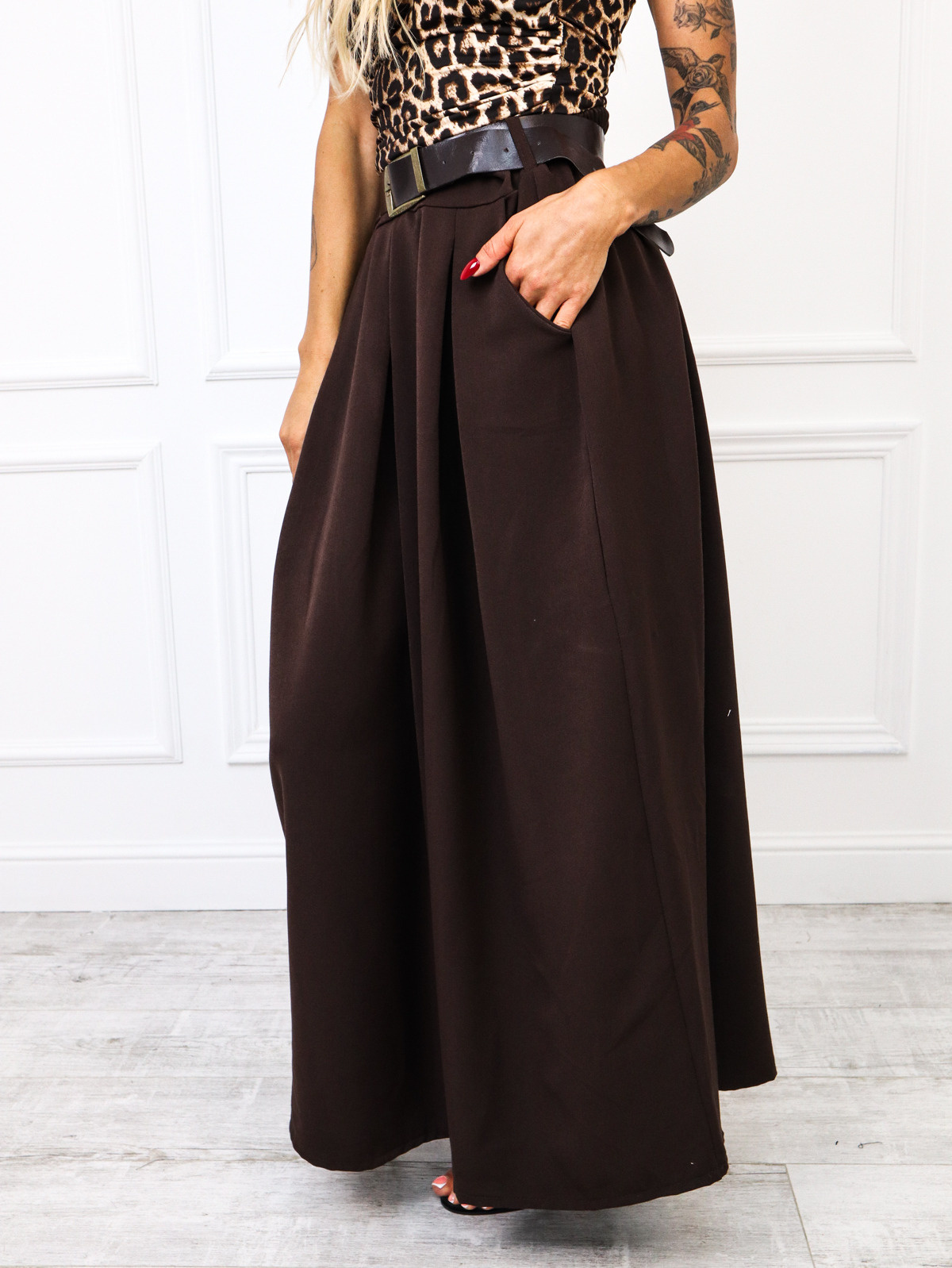 MATERIAŁOWA SPÓDNICA MIDI Z KIESZENIAMI+ PASEK- CIEMNO BRĄZOWA