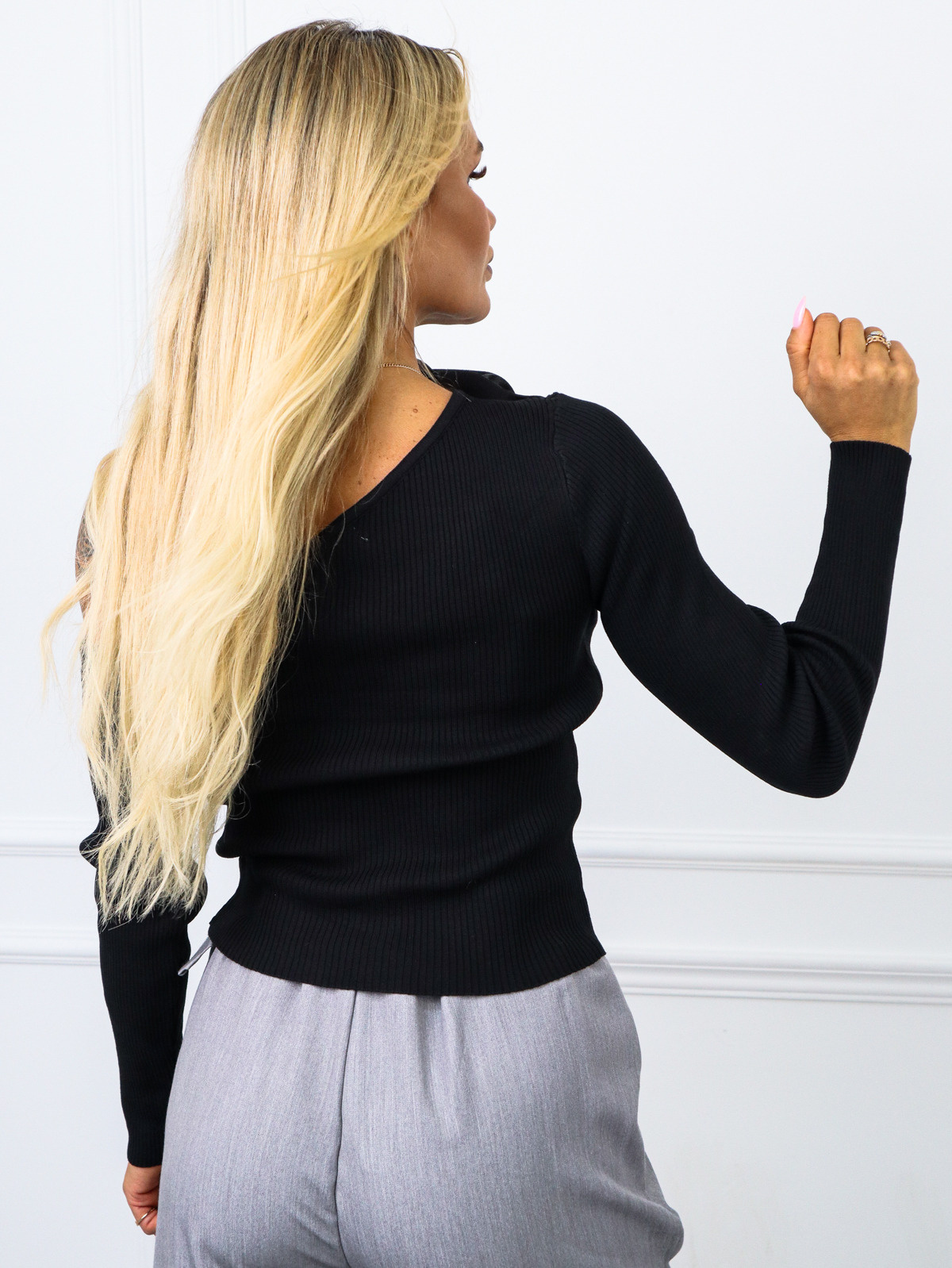 BLUZKA PRĄŻKOWANA NA JEDNO RAMIE Z DUŻYM KWIATEM- CZARNA