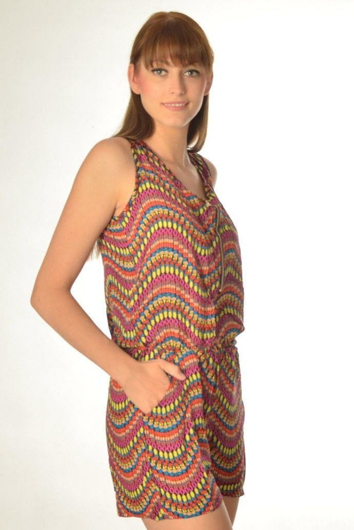 Kombinezon letni w modne wzory tego lat. Posiada krótkie nogawki i jest na ramiączka z zameczkiem złotym pośrodku dekoldu. Świetnie nada się na gorące dni, fesivale czy poprostu na codzień.