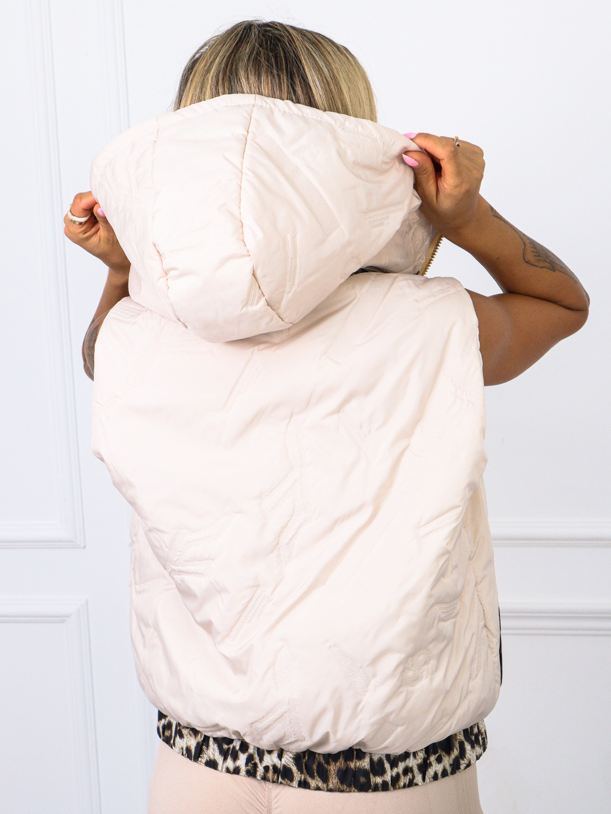 Kamizelka z kapturem, zapinana na złoty zamek. Kontrastowe wstawki w panterkę. Na dole ściągacz.