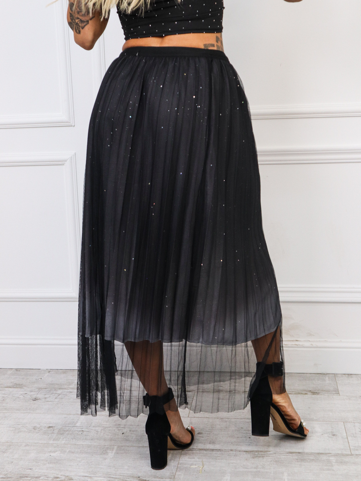 BŁYSZCZĄCA TIULOWA SPÓDNICA MIDI- CZARNA