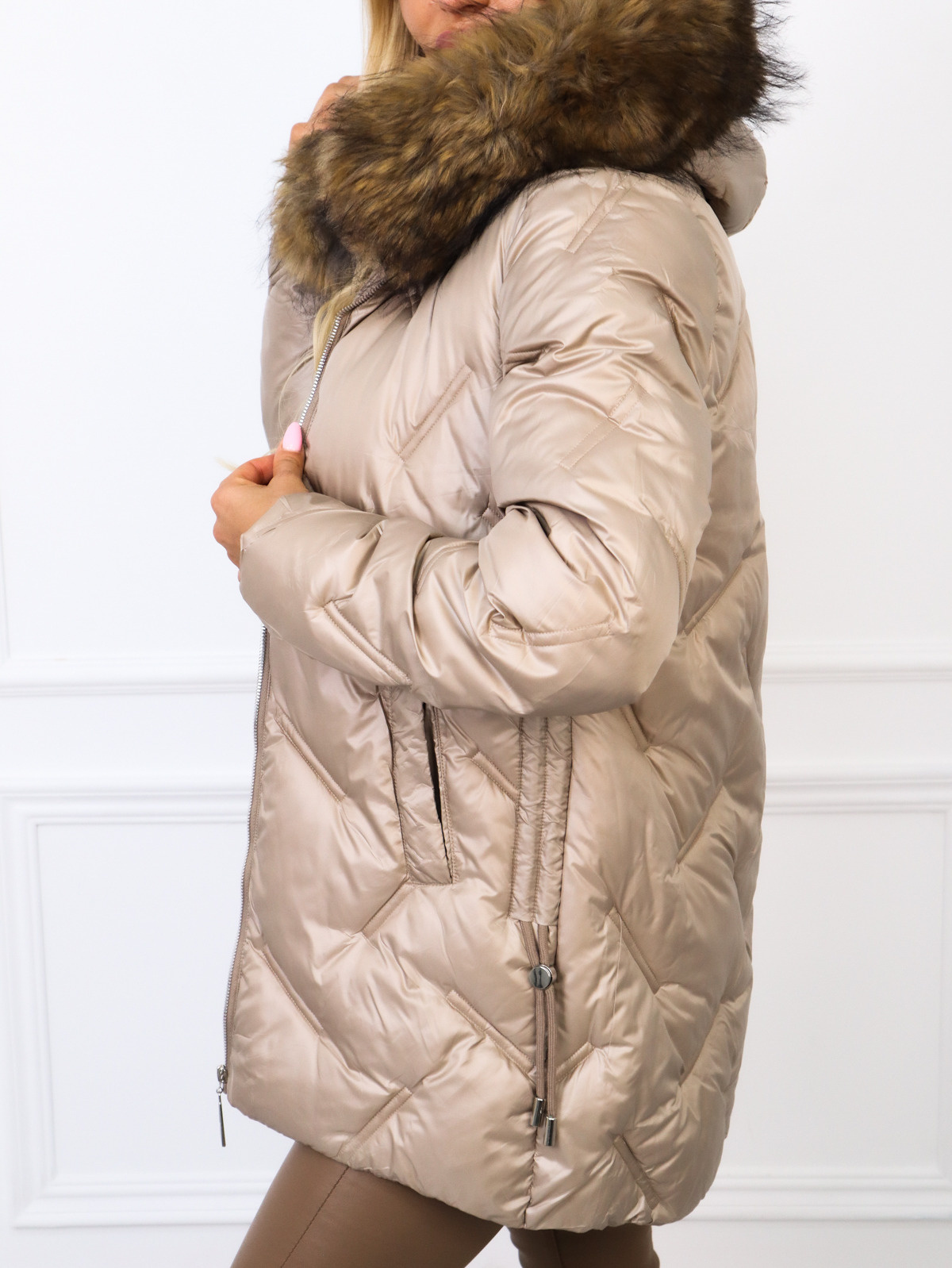 Asymetryczna, pikowana kurtka. Po bokach ściągacze. Odpinane futerko przy kapturze.