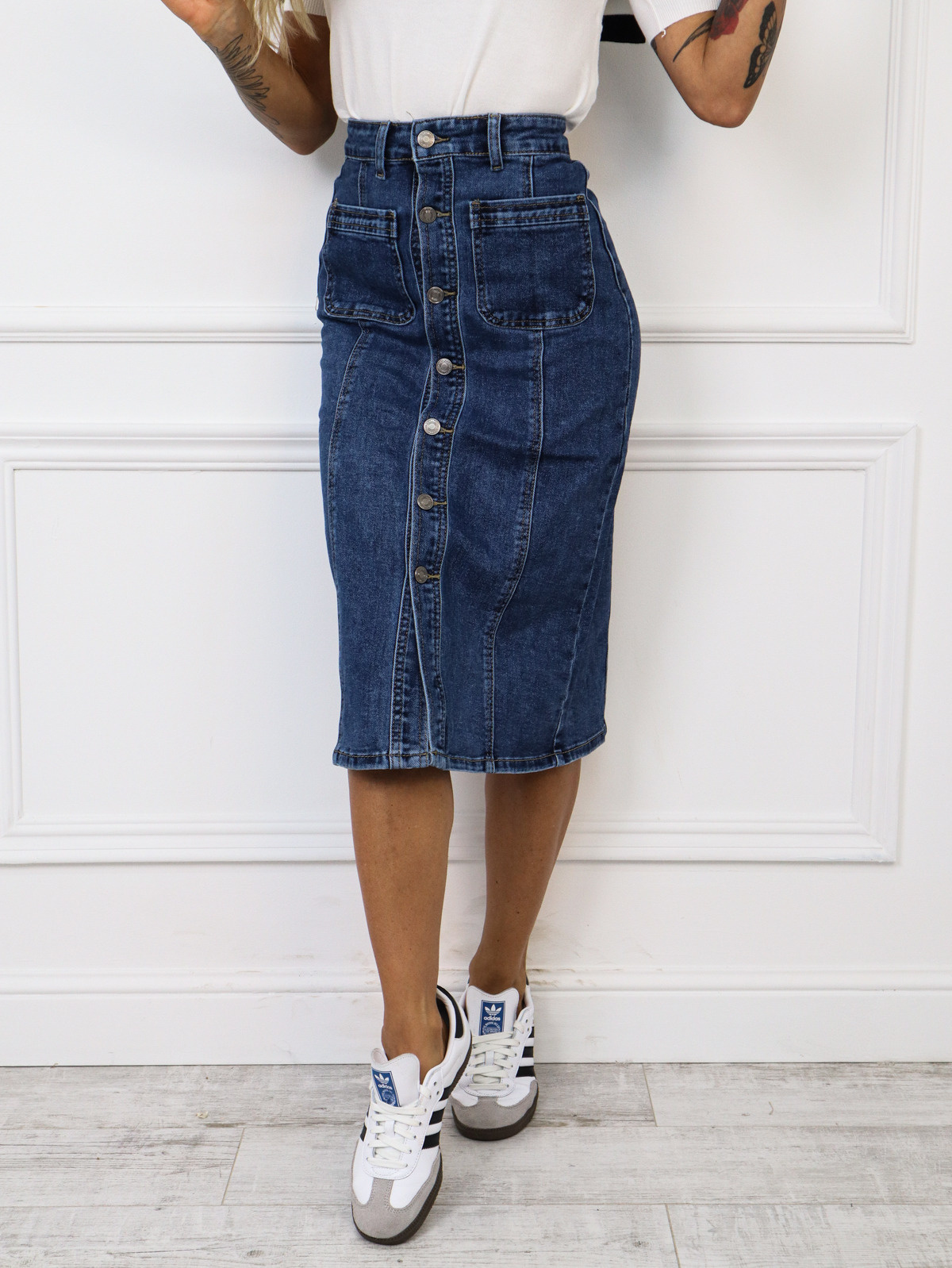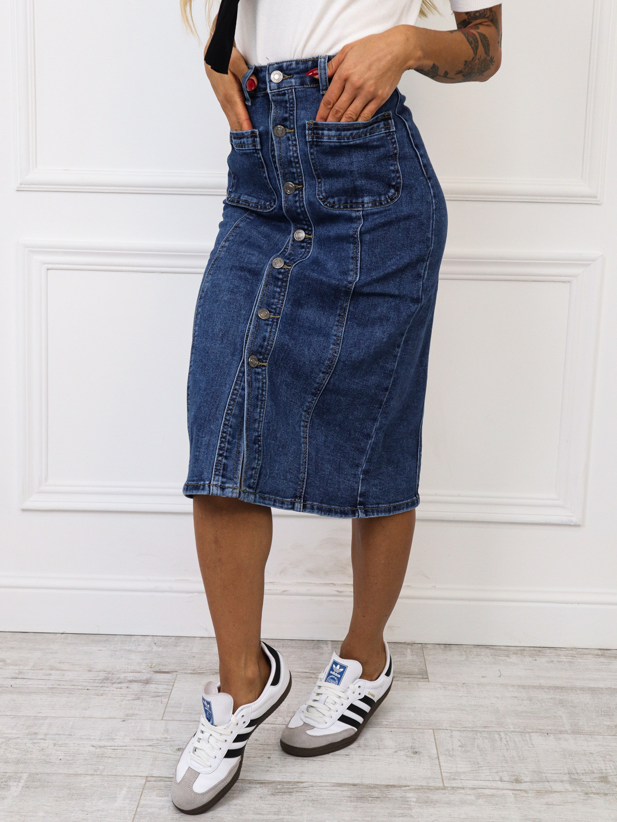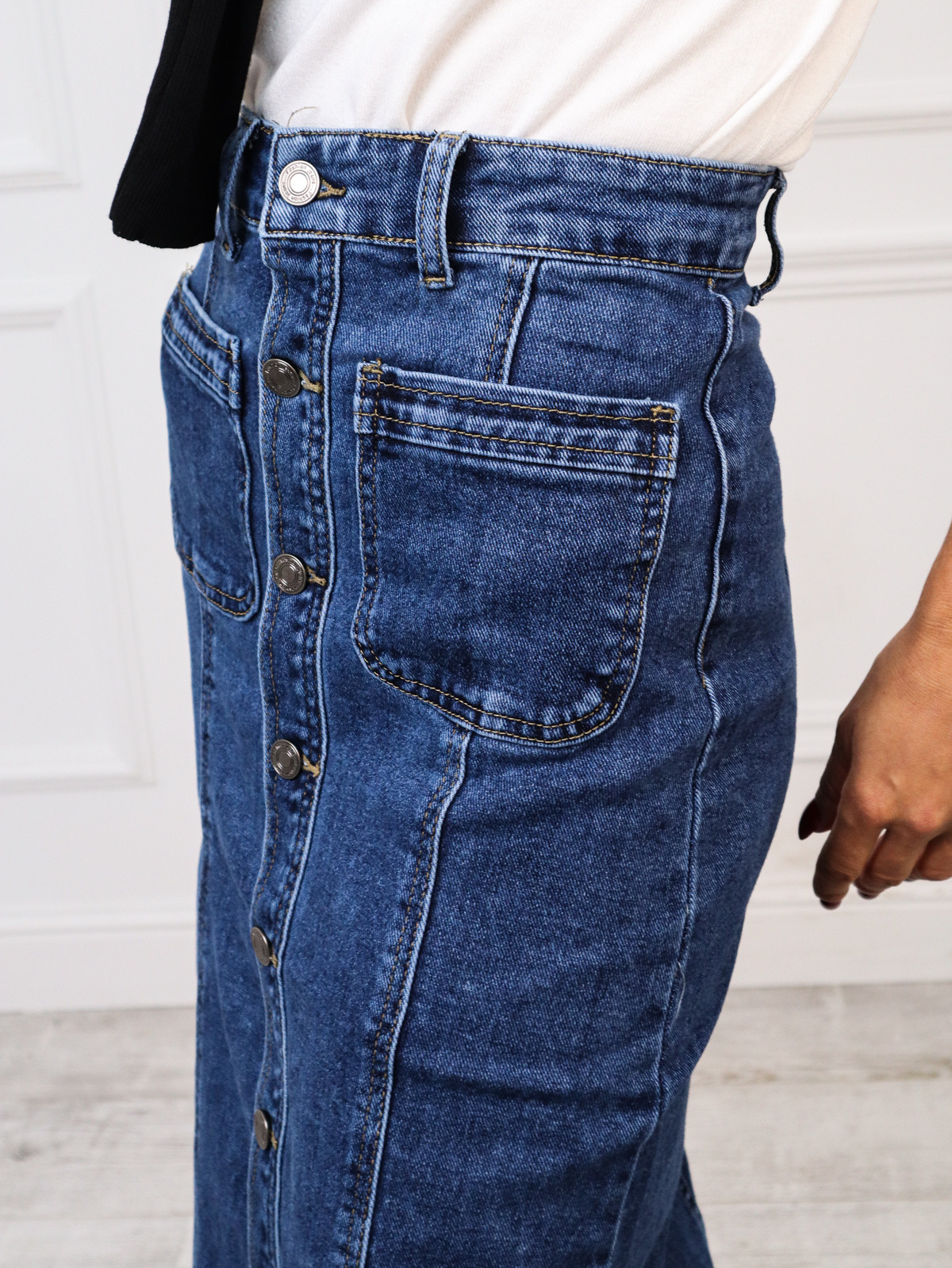 SPÓDNICA JEANSOWA MIDI ZAPINANA NA GUZIKI I KIESZENIE Z PRZODU