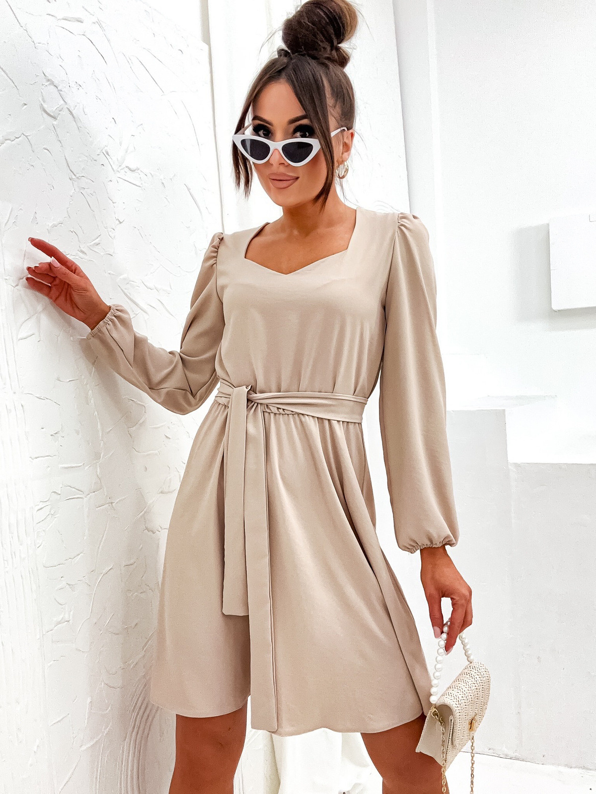 ELEGANCKA ROZKLOSZOWANA SUKIENKA Z PASKIEM- BEŻOWA