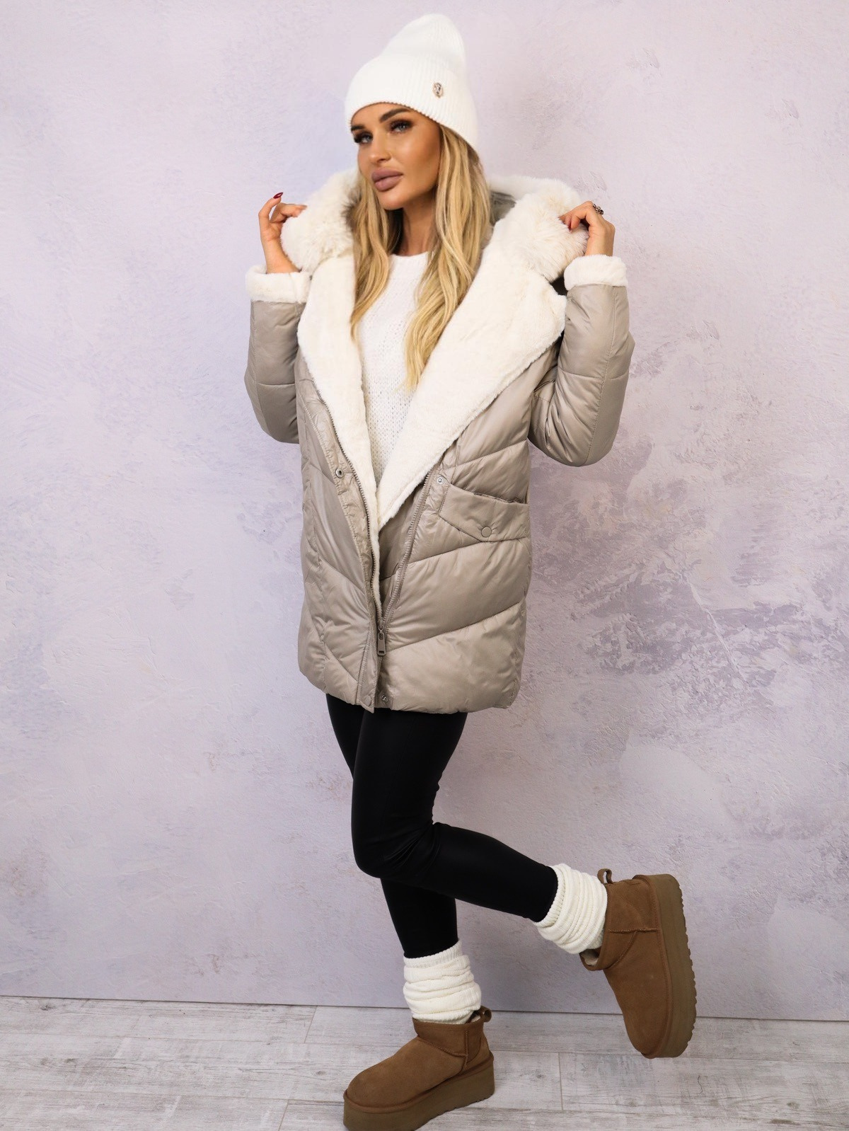 KURTKA PIKOWANA PUCHOWA Z FUTERKIEM NA RĘKAWACH- BEŻOWA