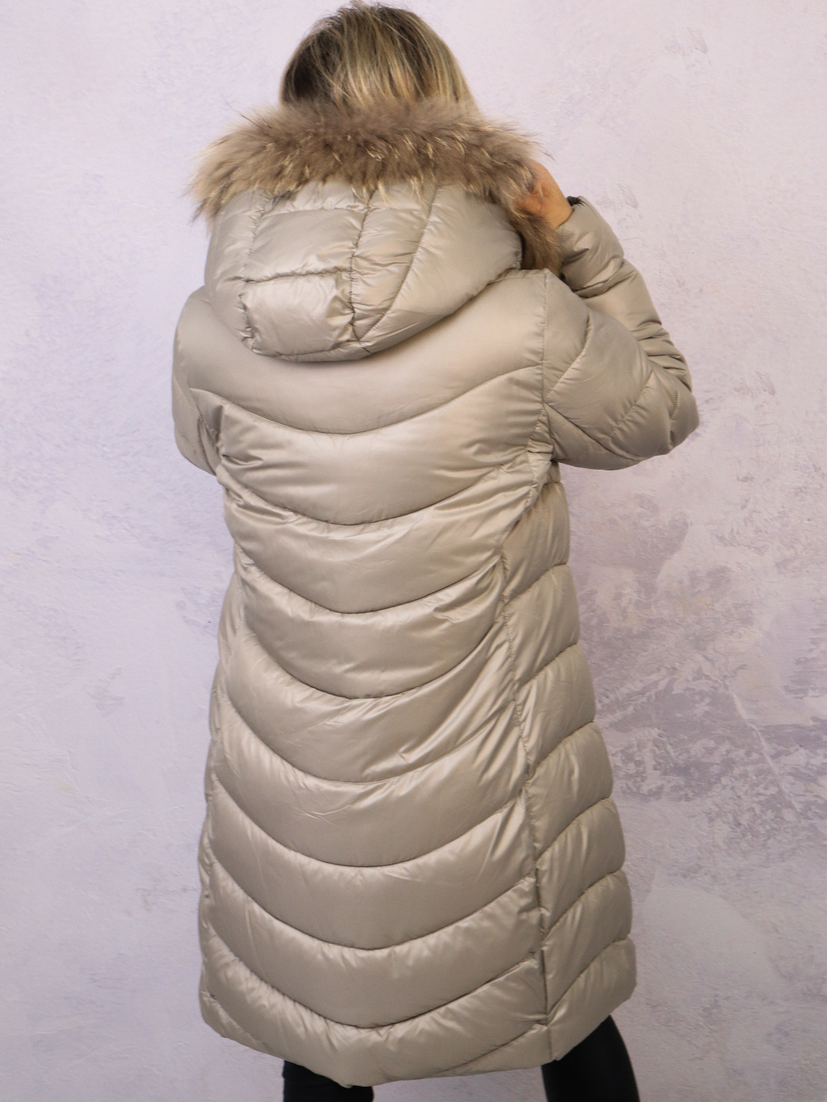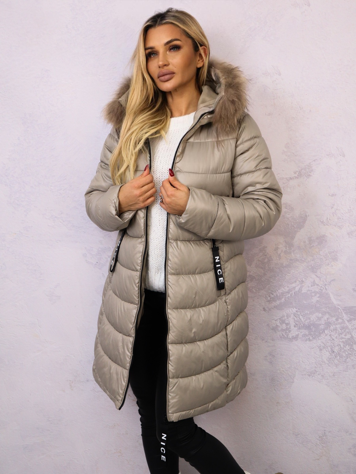 Długa, pikowana kurtka z kapturem. Ozdobne taśmy z napisem przy zamkach. Ściągacze przy rękawach, odpinane futro przy kapturze.