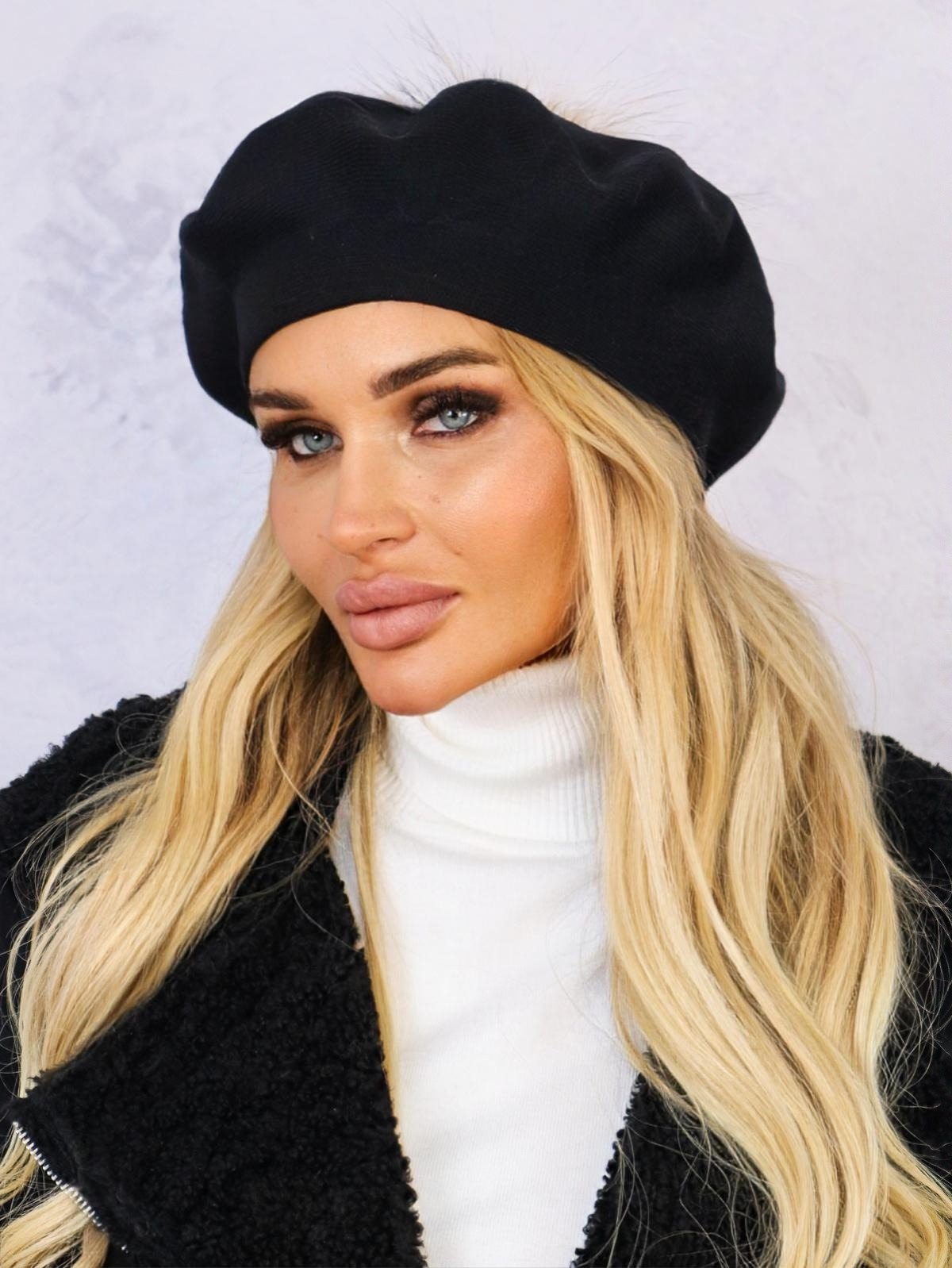 KLASYCZNY BERET DAMSKI Z POMPONEM- CZARNY