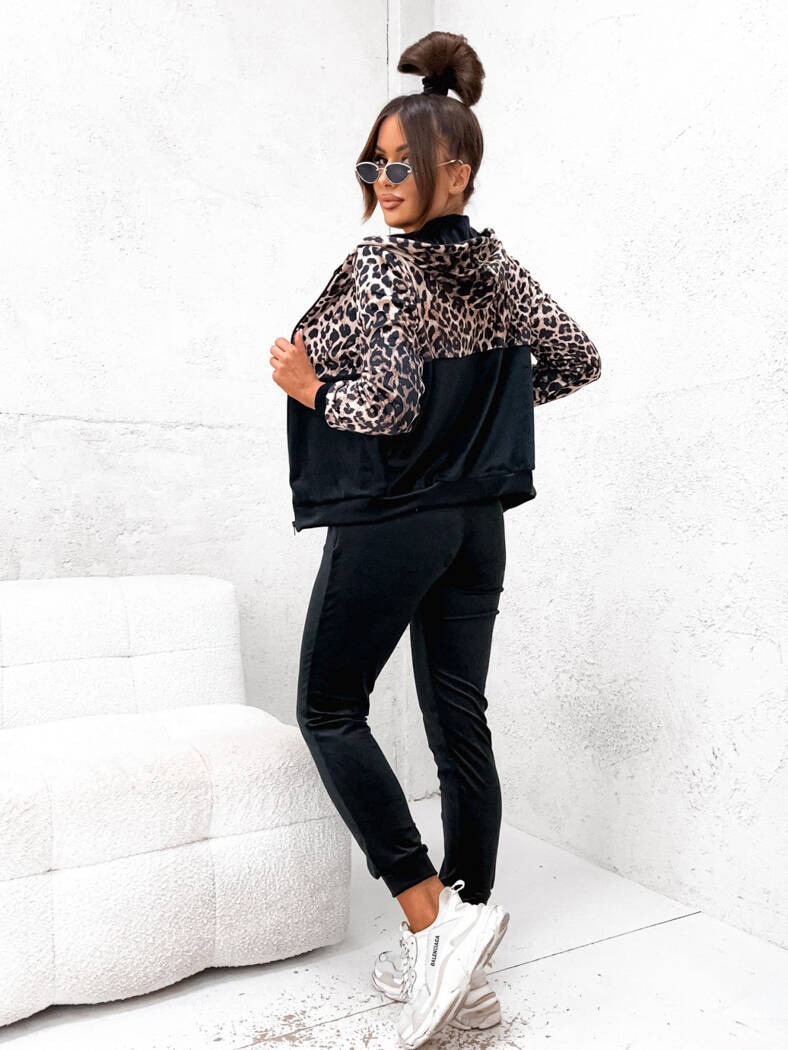 Welurowy komplet dresowy. Bluza z kapturem, zapinana na zamek. Wzór panterki. Spodnie z gumą w pasie i ściągaczami na dole nogawek.