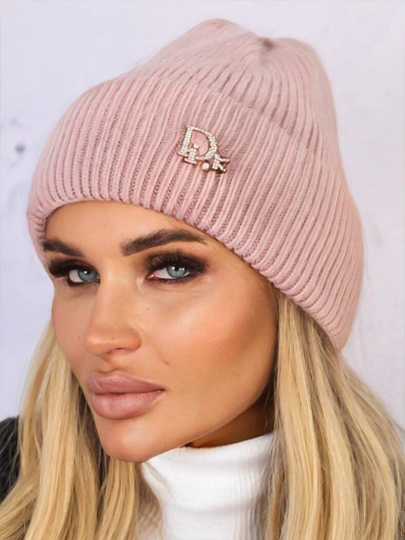CZAPKA ZIMOWA Z BROSZKĄ W CYRKONIE DiK- RÓŻOWY
