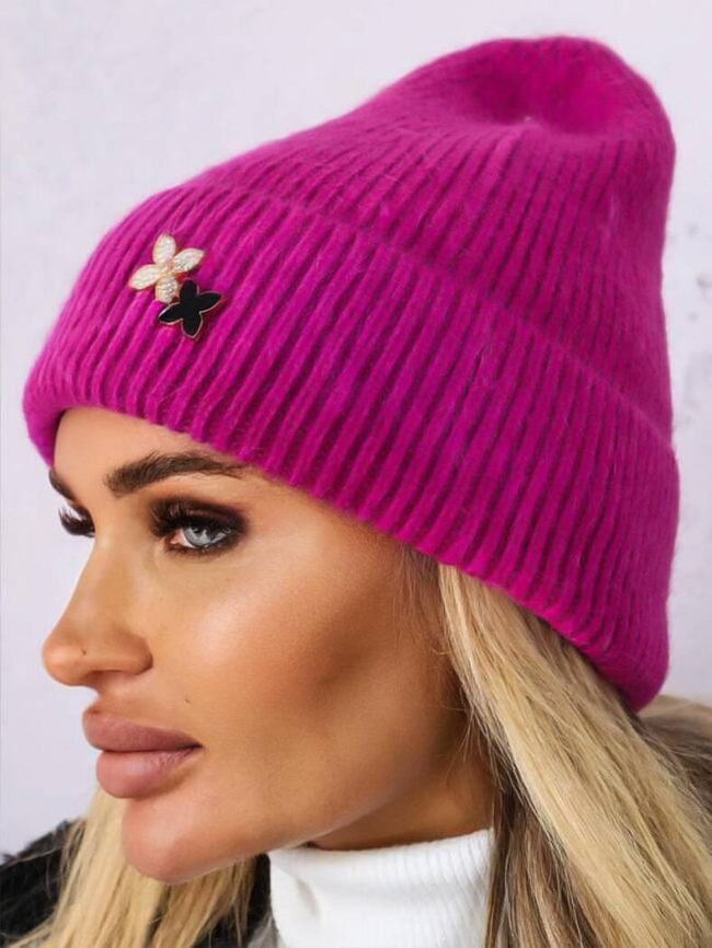 ZIMOWA CZAPKA Z BROSZKĄ W KWIATY- CIEMNY RÓŻ