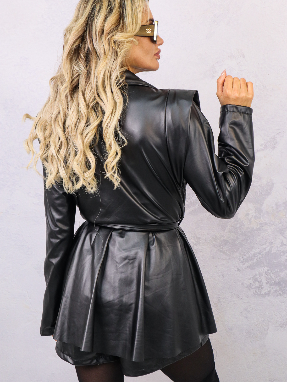 KOMBINEZON Z IMITACJI SKÓRY WIĄZANY W PASIE- CZARNY
