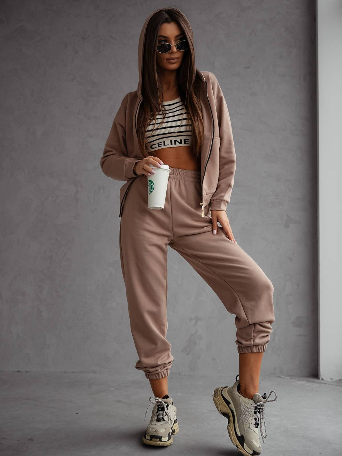BAWEŁNIANY KOMPLET DRESOWY BLUZA ROZPINANA+ SPODNIE- BRĄZOWY