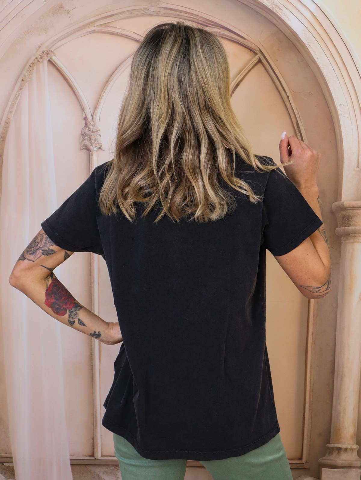 CZARNY DEKATYZOWANY T-SHIRT Z PRINTEM